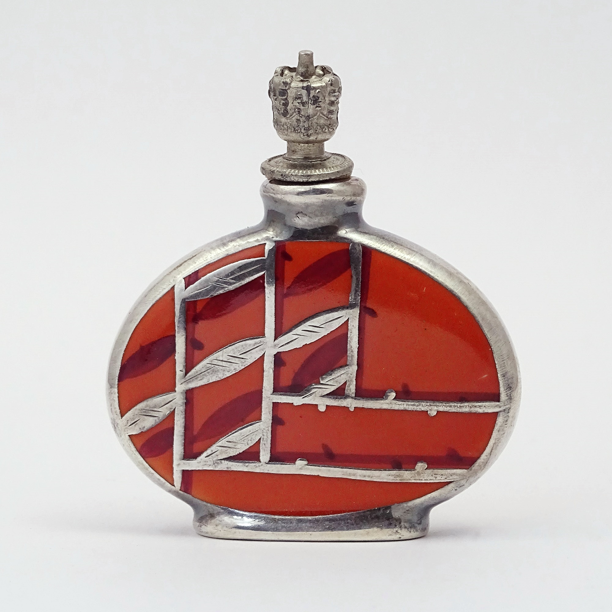 Home » Collection » Silver overlay dark orange porcelain scent bottle with abstract Deco design