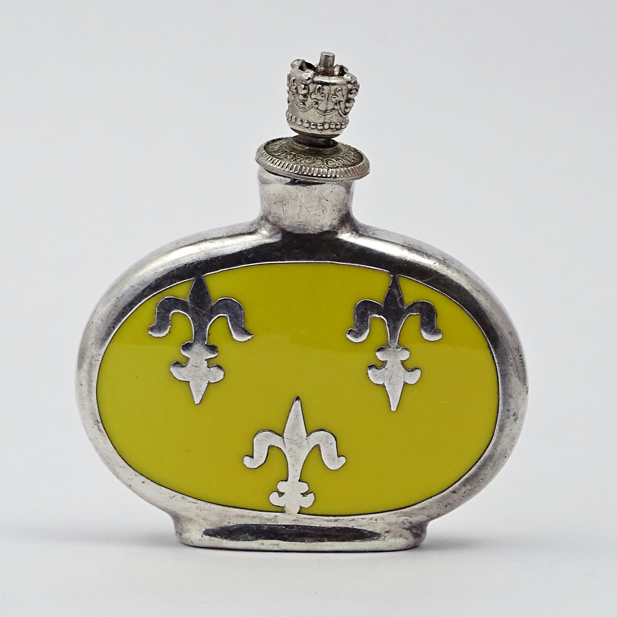Yellow enamelled porcelain scent bottle with silver overlay depicting a corner view of the monumental Neoclassical Kurhaus (“spa house”) and the word Wiesbaden. This building was built at the request of Kaiser Wilhelm II between 1904 and 1907. On the back a crest with three fleur-de-lis (lilies), identical to the former French Royal arms. Crown metal top. The silver is marked Deusch 1000.