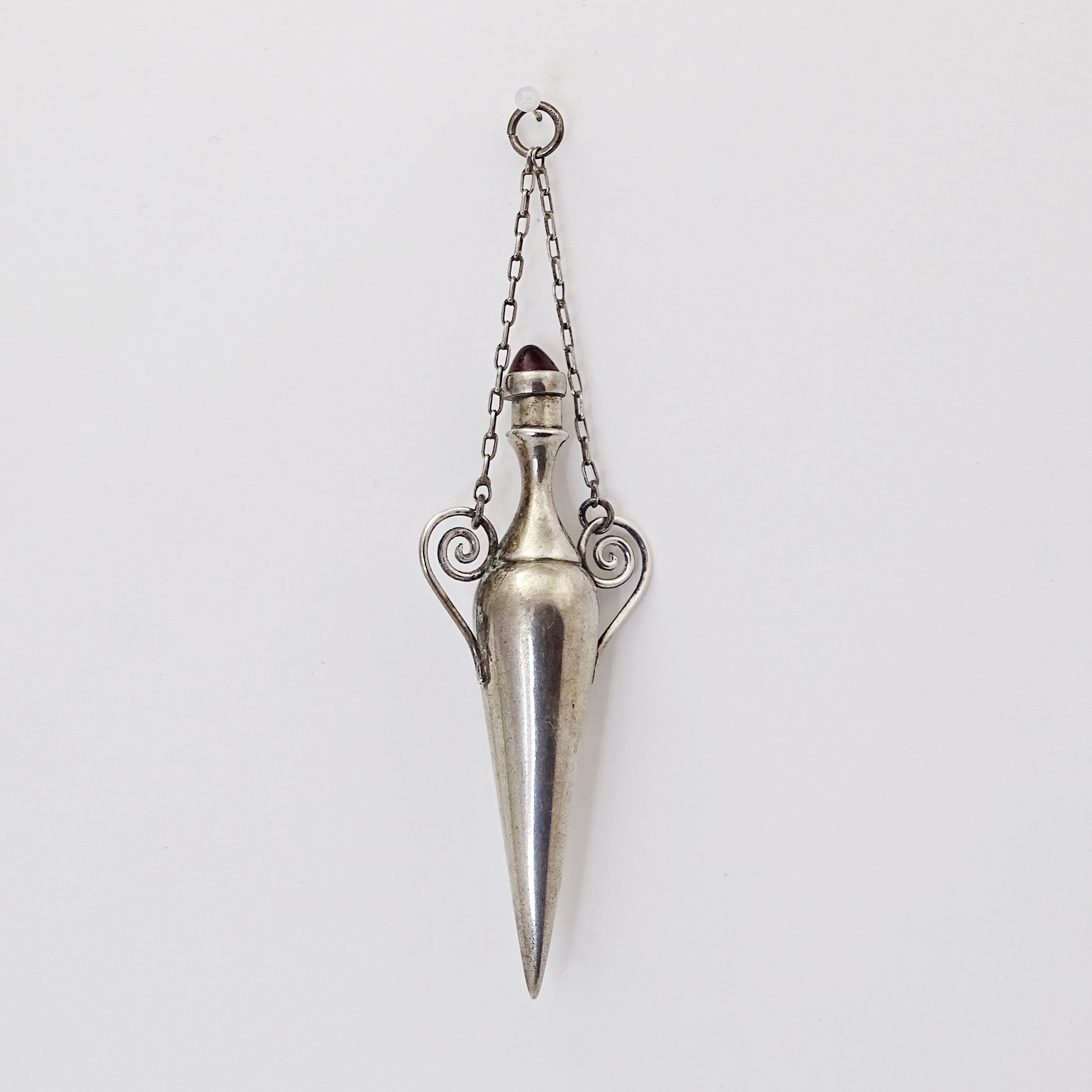 with screw cap surmounted by a garnet cabochon. Curled handle with suspension chain and little ring. No marks.