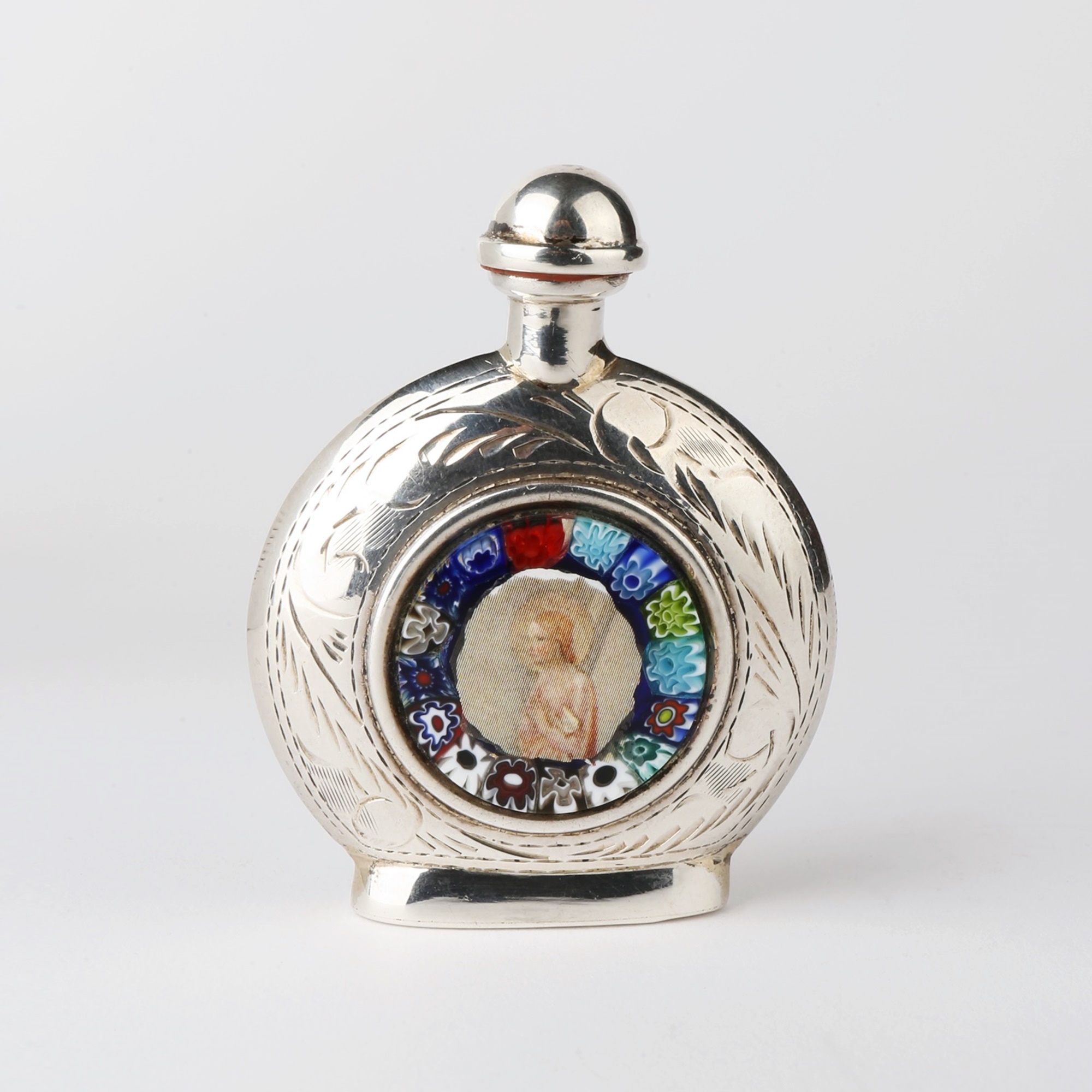 Flat round silver scent bottle. On the front it shows a central medallion decorated with a “murrine” garland and the figure of Virgin Mary from “The Annunciation”, fresco by Beato Angelico painted in the Friary of Saint Marco in Florence. The back is chased with a formal decoration. Screw silver cap with wand. On the bottom it is marked for silver (925).