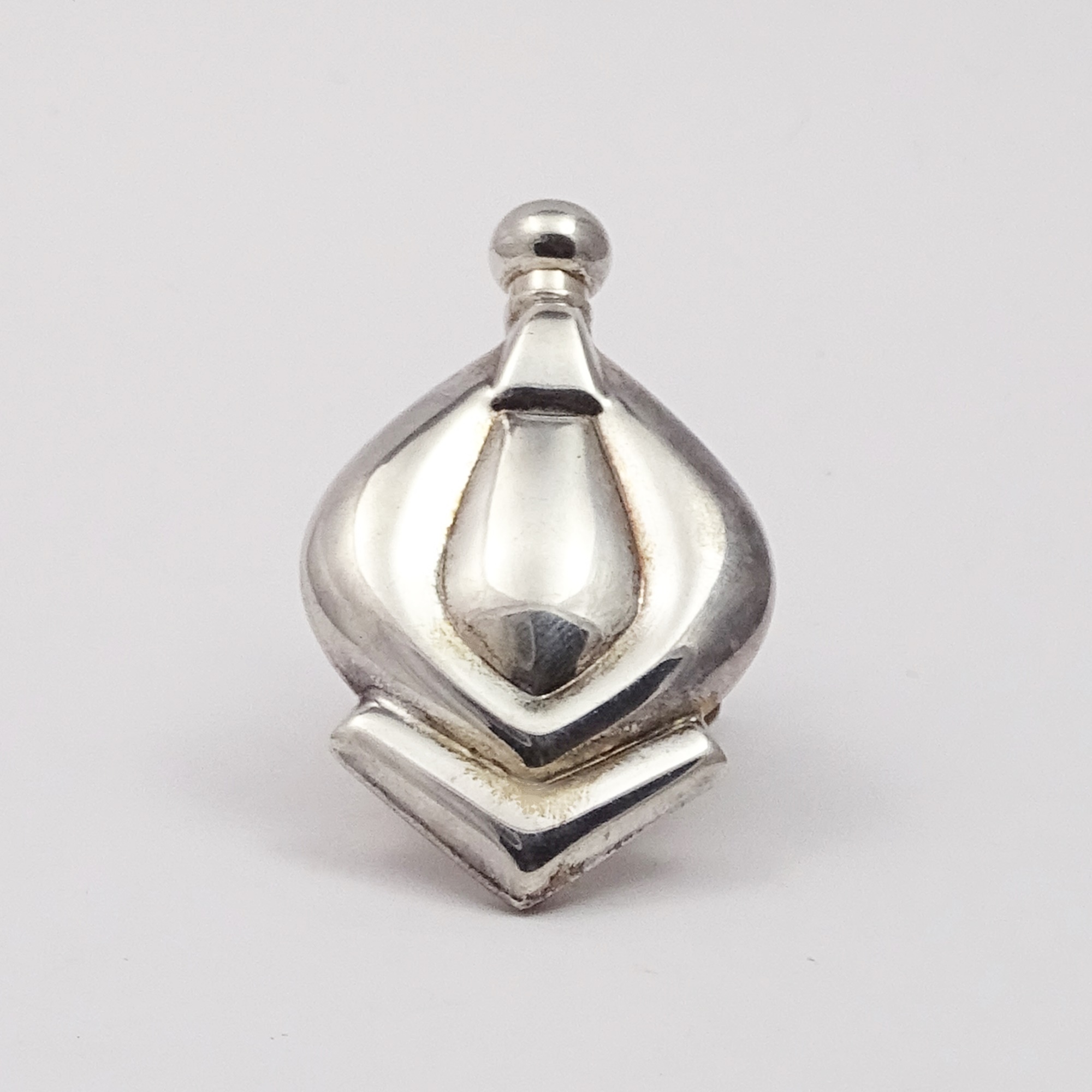 Scent-jar in closed pomander form, in silver with chased floral ornaments. It opens in four parts: the bottom contains a sponge th...
