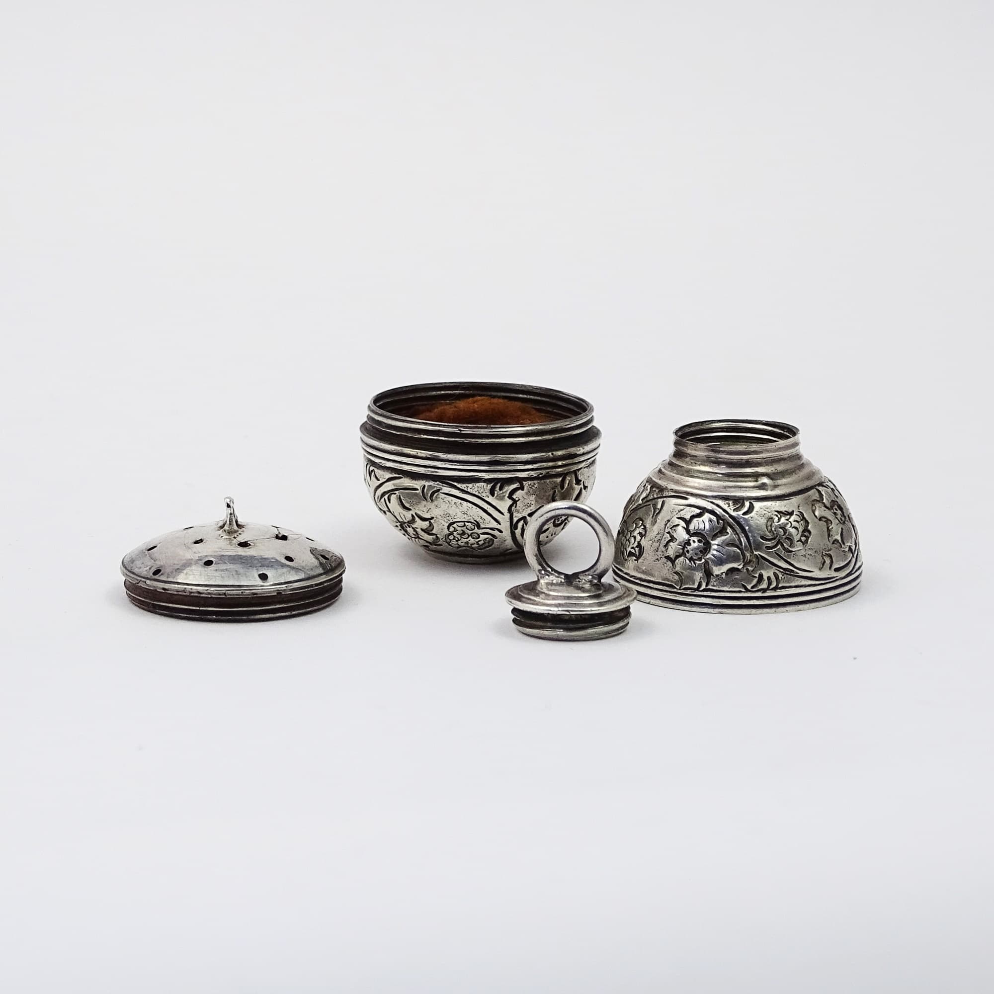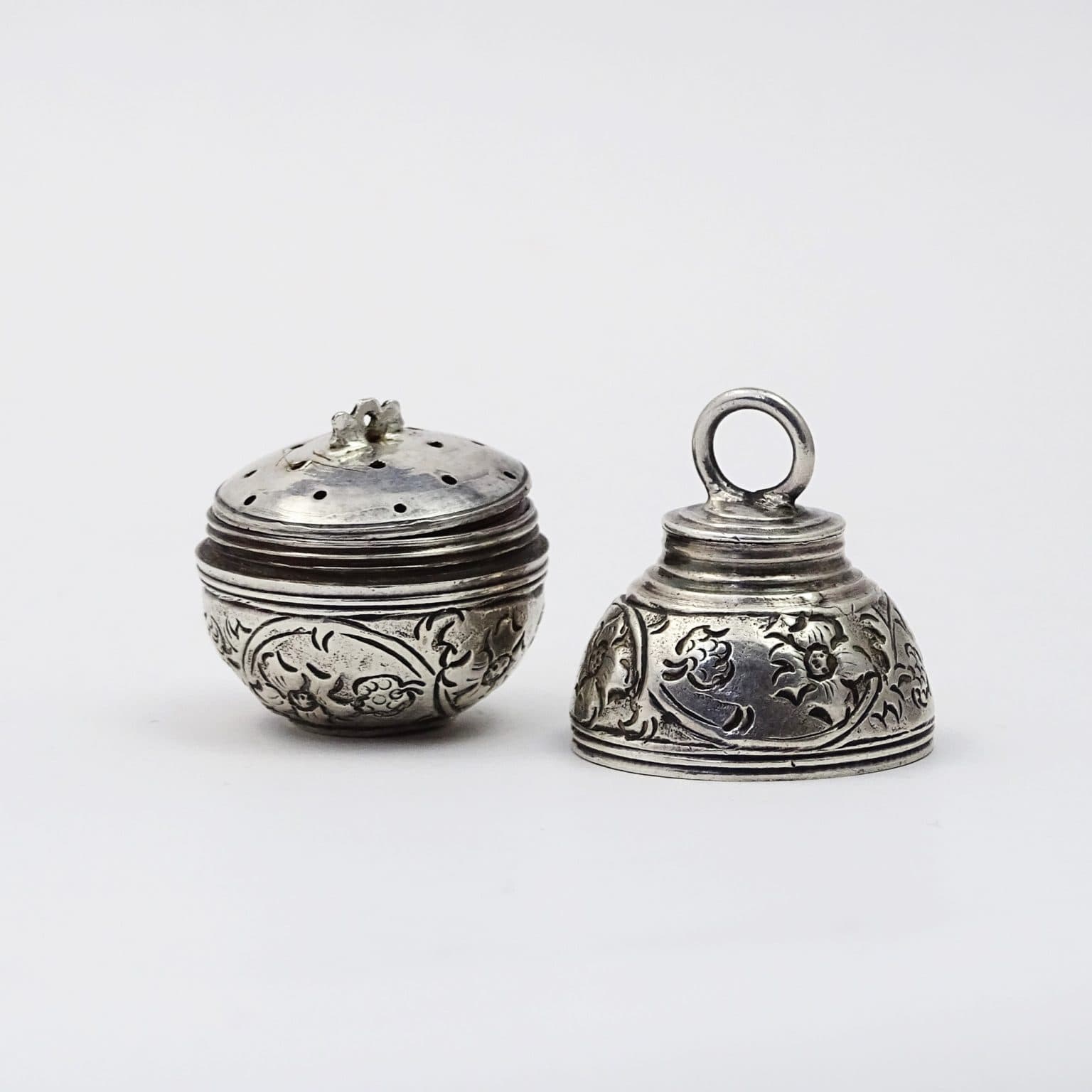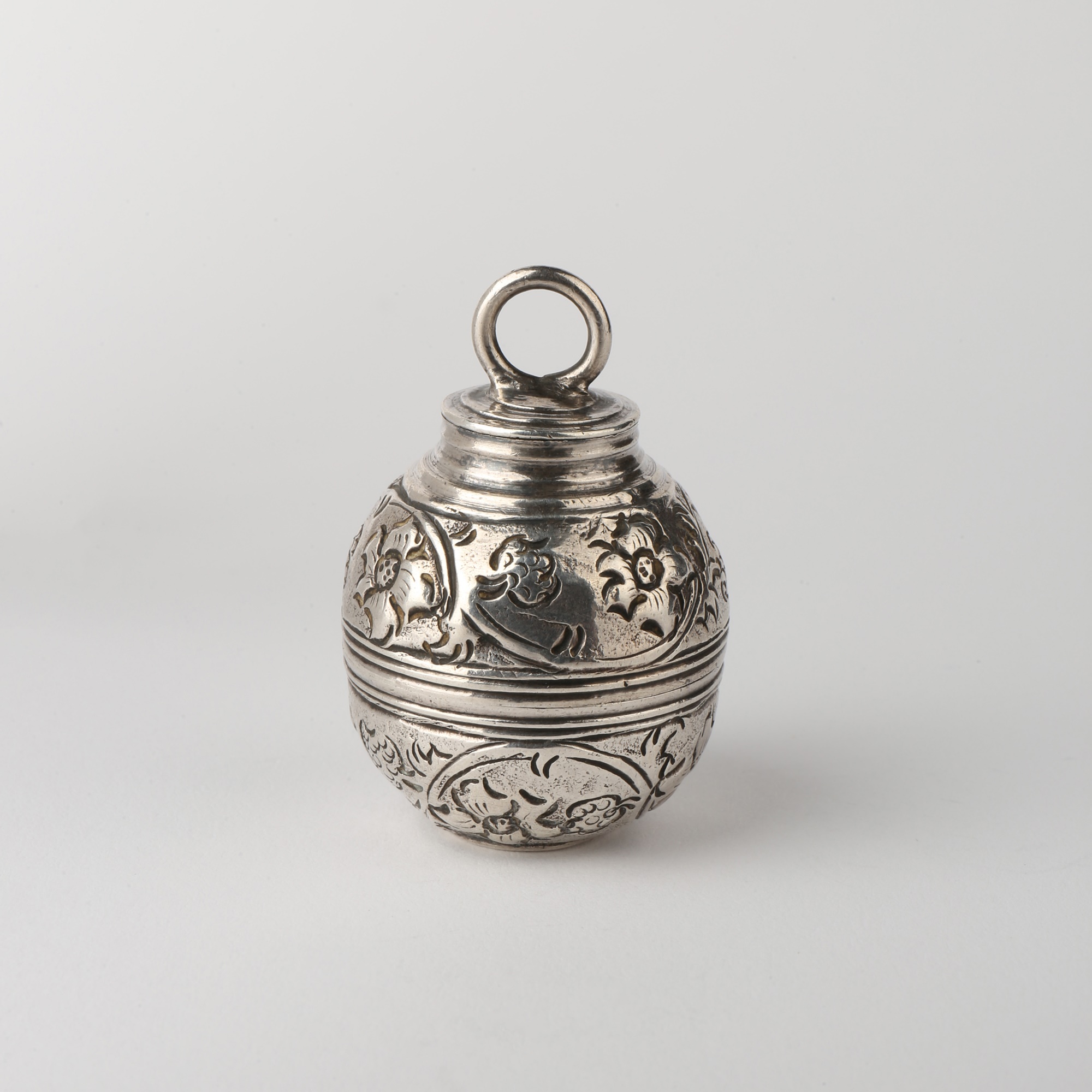Scent-jar in closed pomander form, in silver with chased floral ornaments. It opens in four parts: the bottom contains a sponge that was soaked in essence; the lid of the container has small holes; the tiny compartment under the ring retains traces of white powder (possibly poison or medicine).