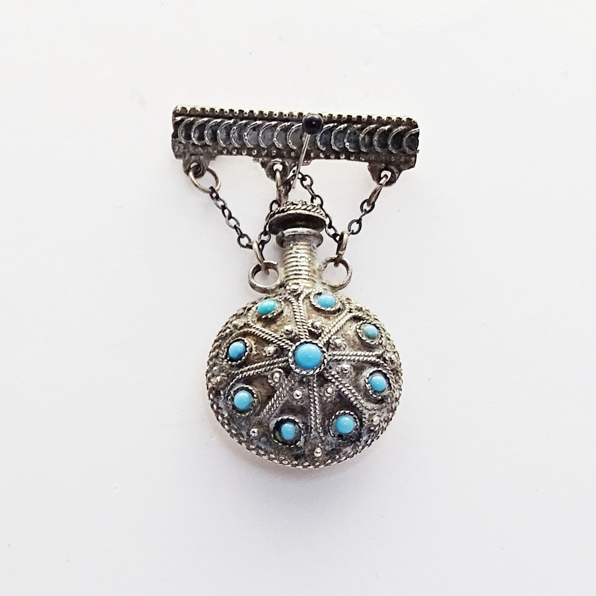 Silver stick brooch with a round scent bottle hanged with three little crossed chains. The silver filigree is enriched by seven embedded turquoises. Screw cap with metal wand.