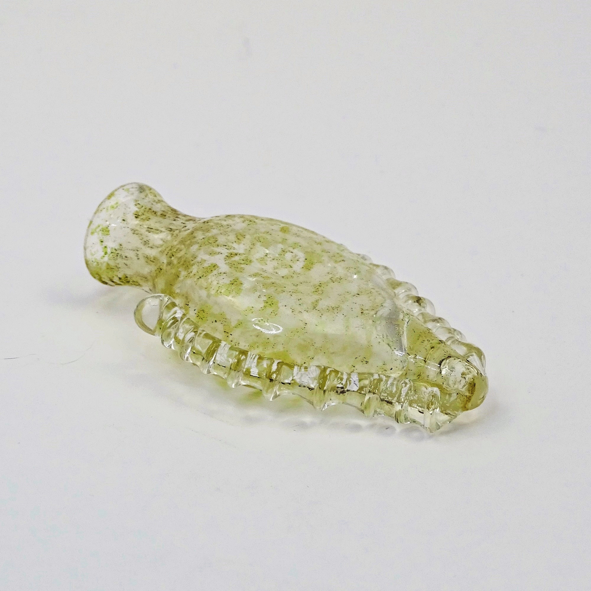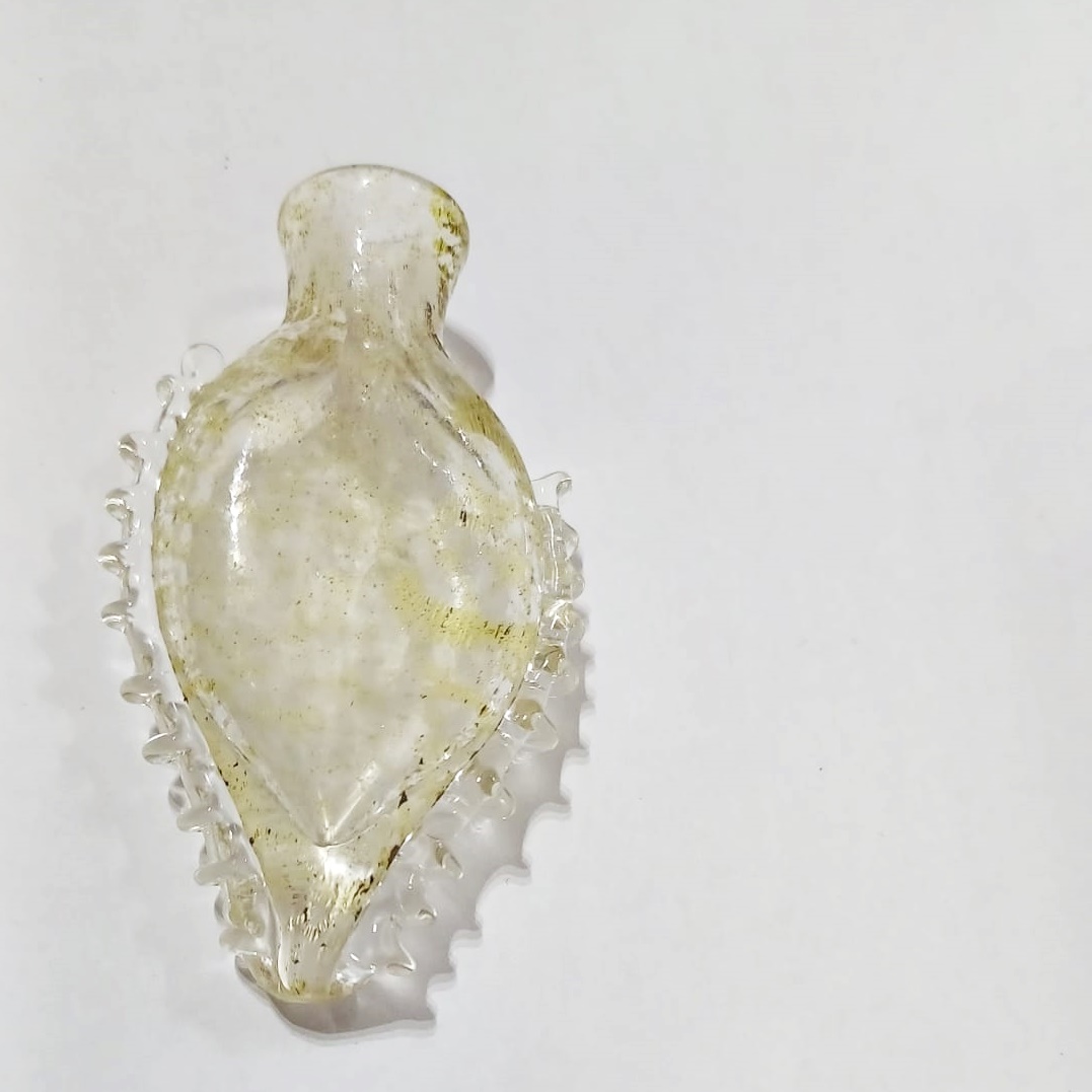 Slightly concave teardrop scent bottle in clear glass with “morise” decoration found in an excavation during the great cleaning of the Venice’s channels in 1956. It bears the traces of a long stay in the water.