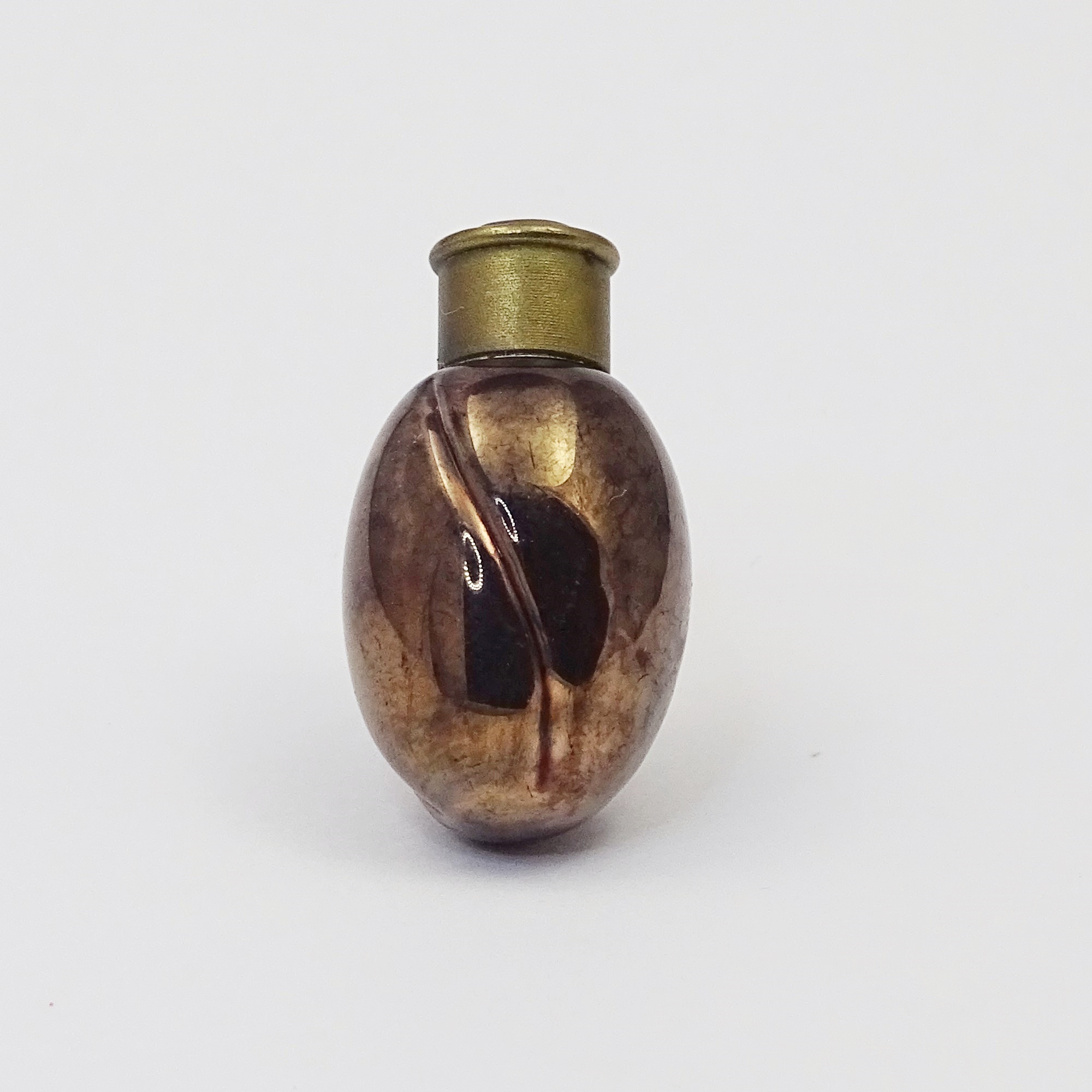 Tiny egg-shaped scent bottle in gold and silver leaf Murano glass, imitating a rosebud, perhaps produced by the Toso brothers, active in Murano since 1860. Brass screw cap. A series of seemingly unique pieces.