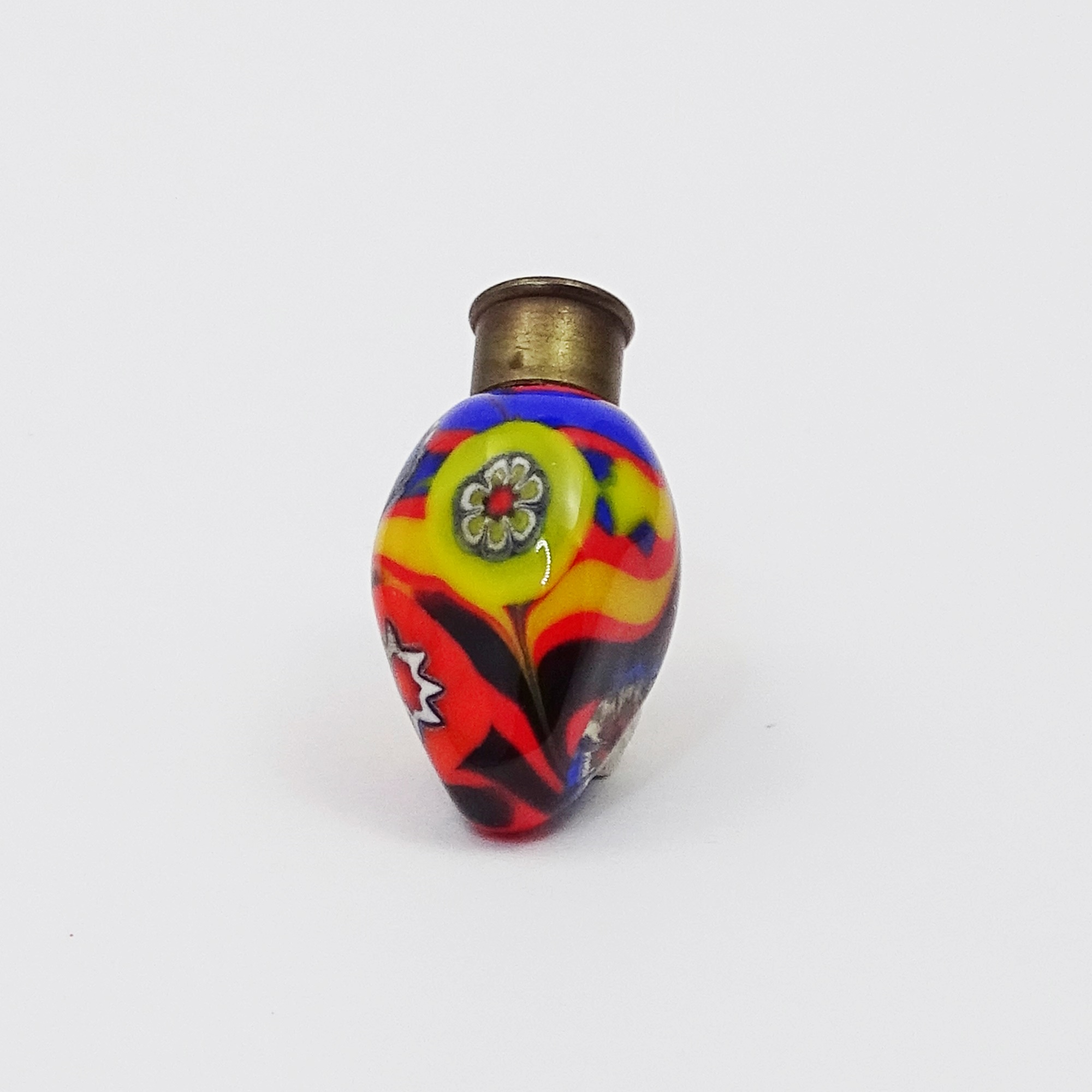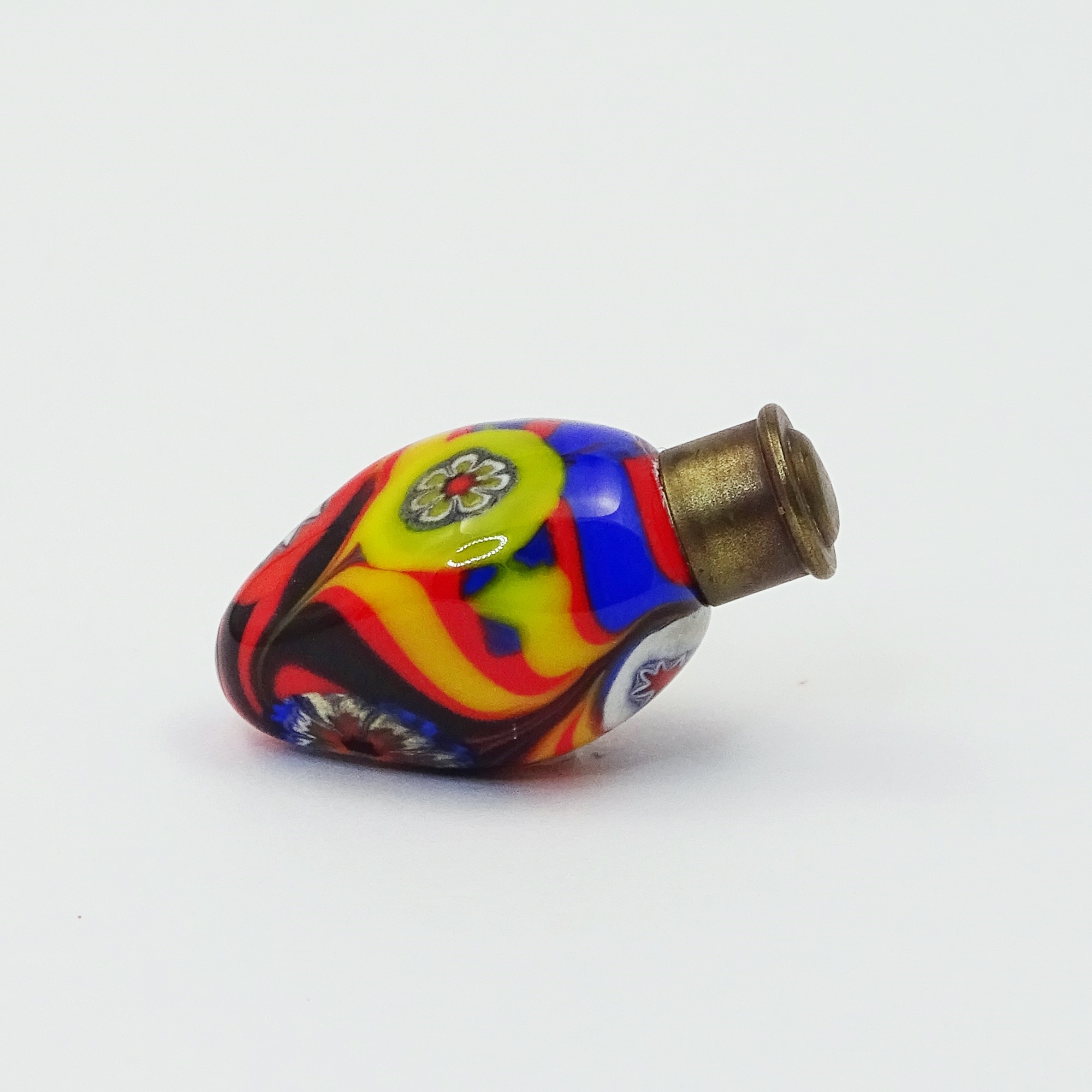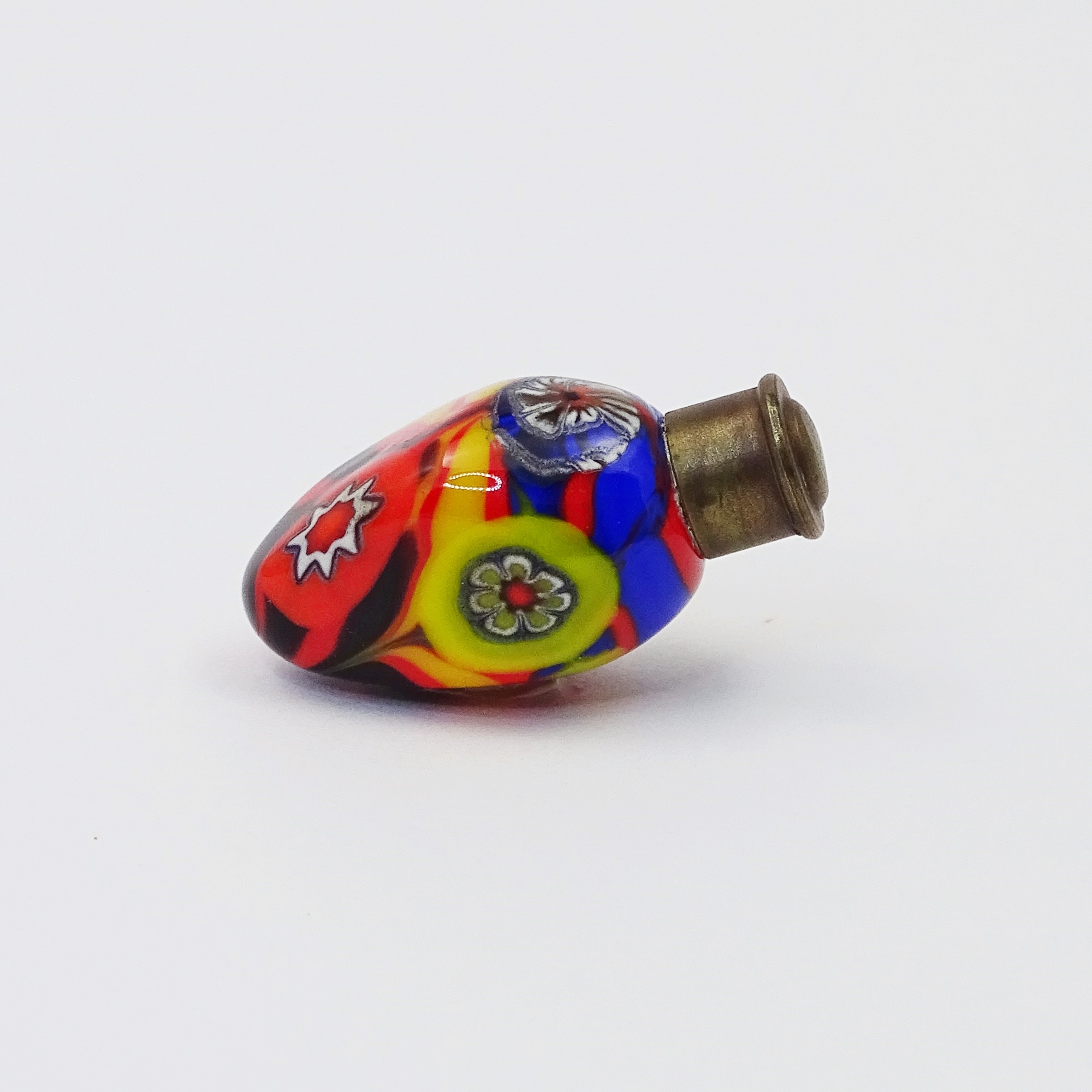 Tiny tear-drop scent bottle in millefiori glass with flowers-shaped murrine, perhaps produced by the Toso brothers, active in Murano since 1860. Brass screw cap. A series of seemingly unique pieces.
