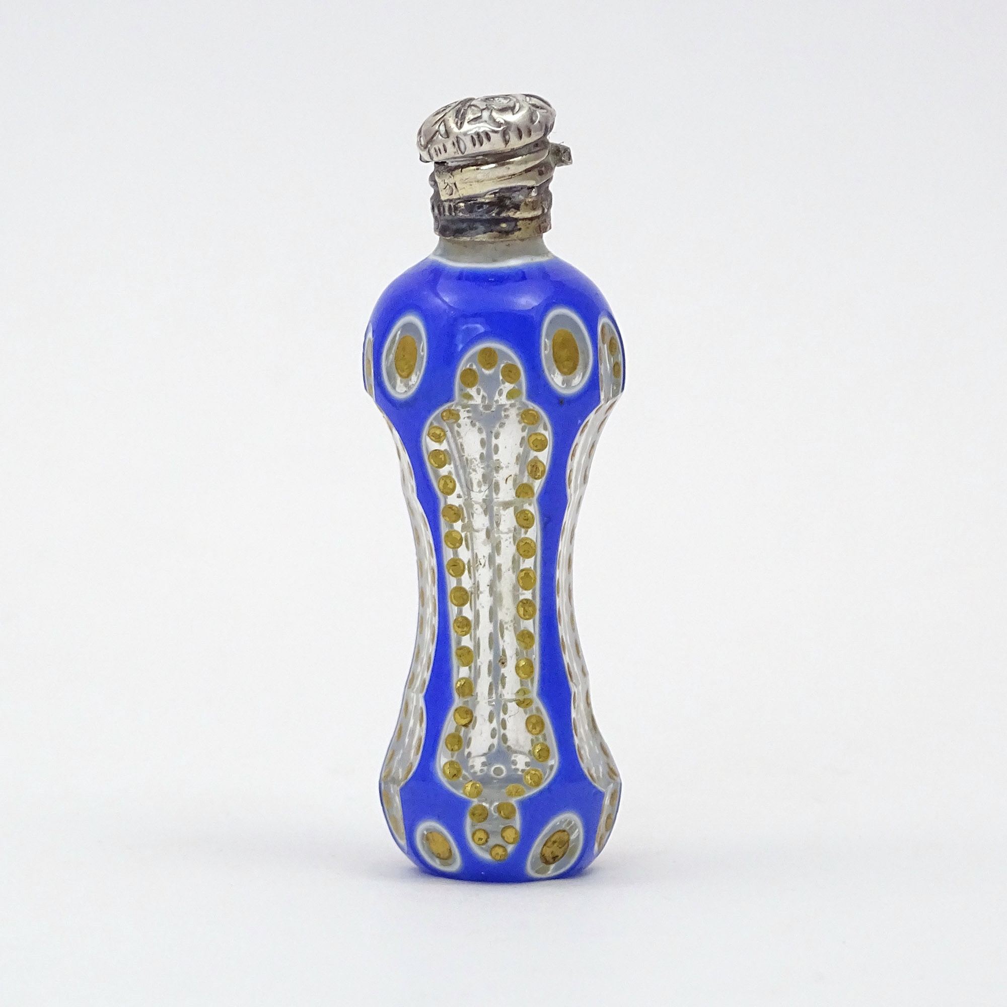 Small waisted clear glass scent bottle with blue overlay. The coat is cut to clear the glass beneath forming a decor completed with golden dots. Hinged silver cap with floreal pattern. Marks for 1838/1860 period.