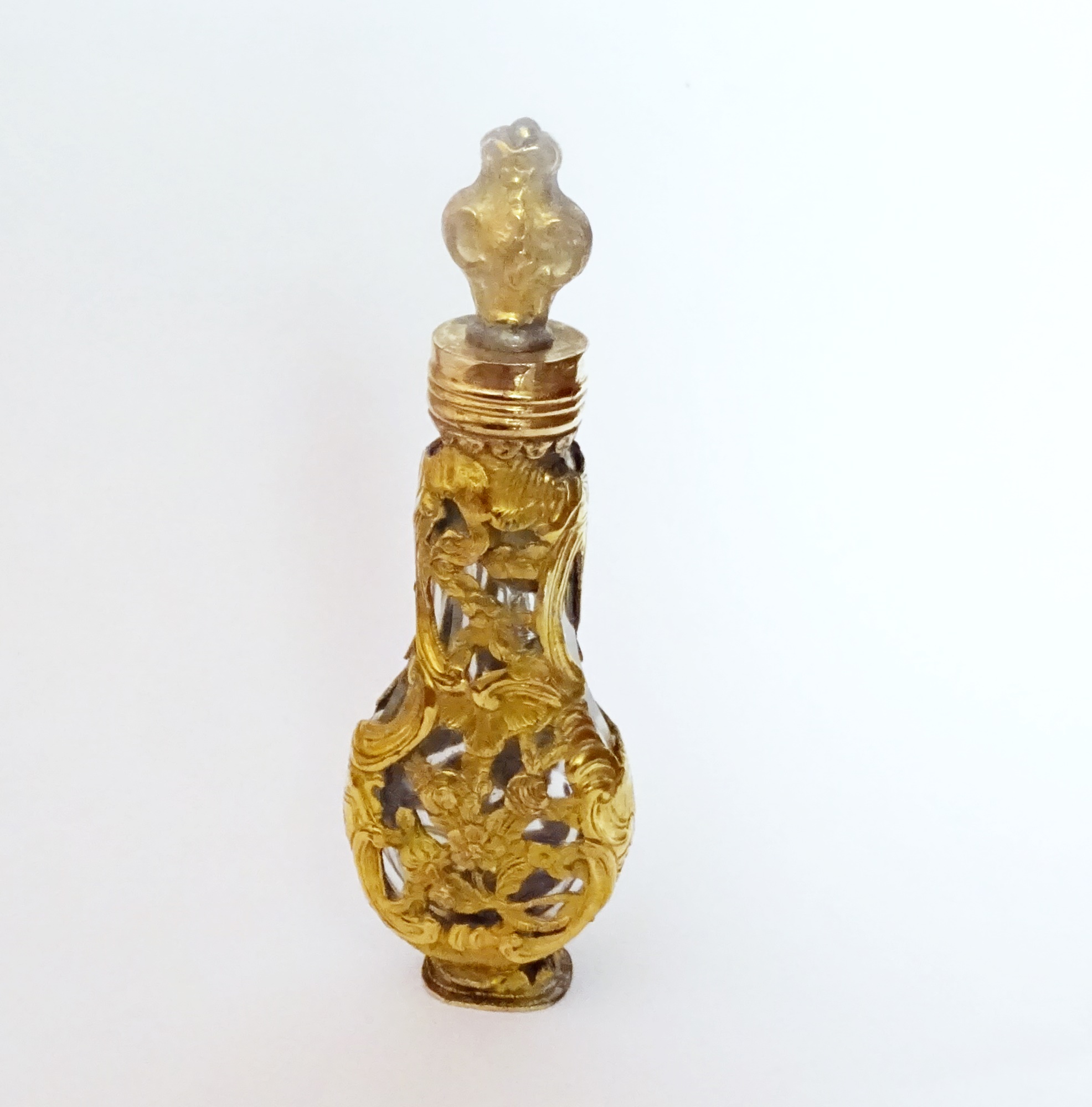 Smoked lead glass scent bottle enclosed in a gold cagework with seal