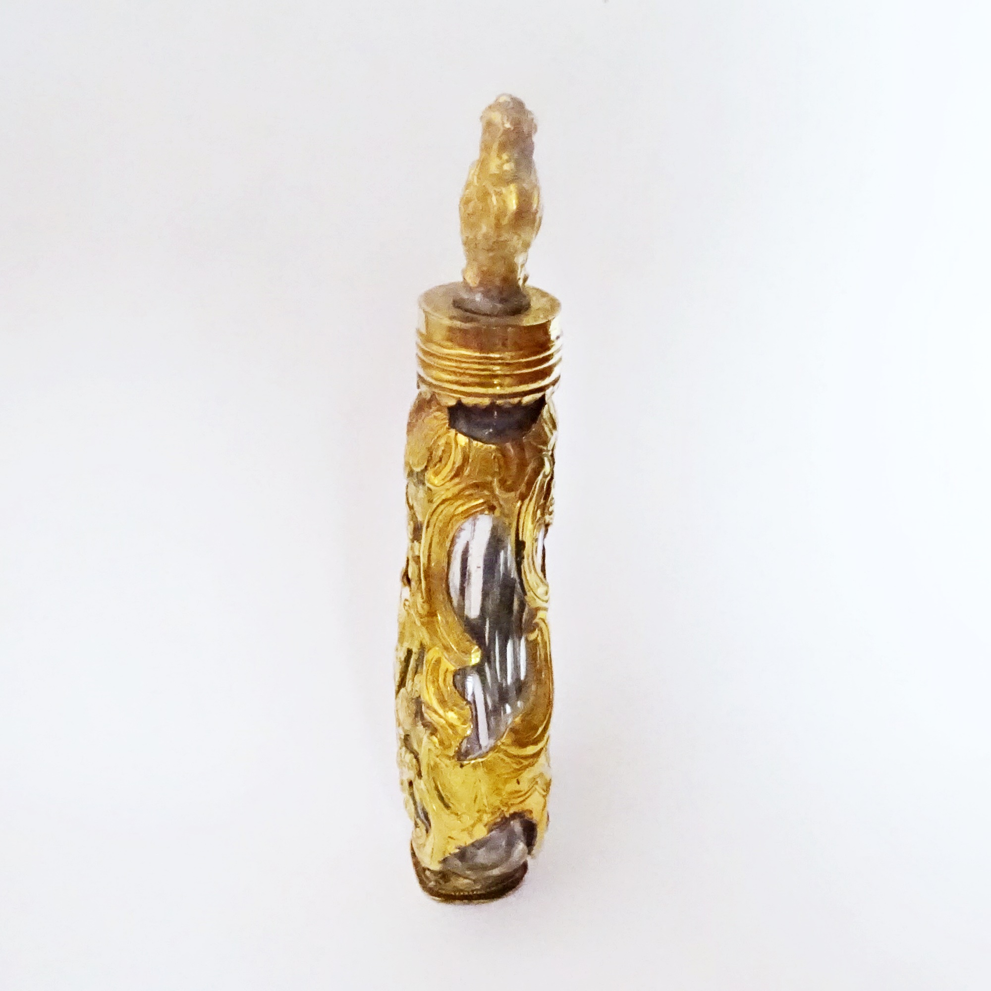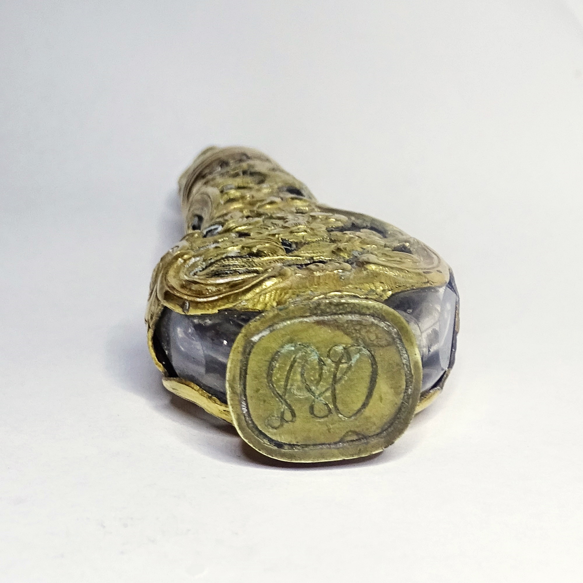 Smoked lead glass scent bottle enclosed in an rich gold openwork cage. Matching ornated cap in gold and metal. On the bottom a monogram is carved to use as a seal.