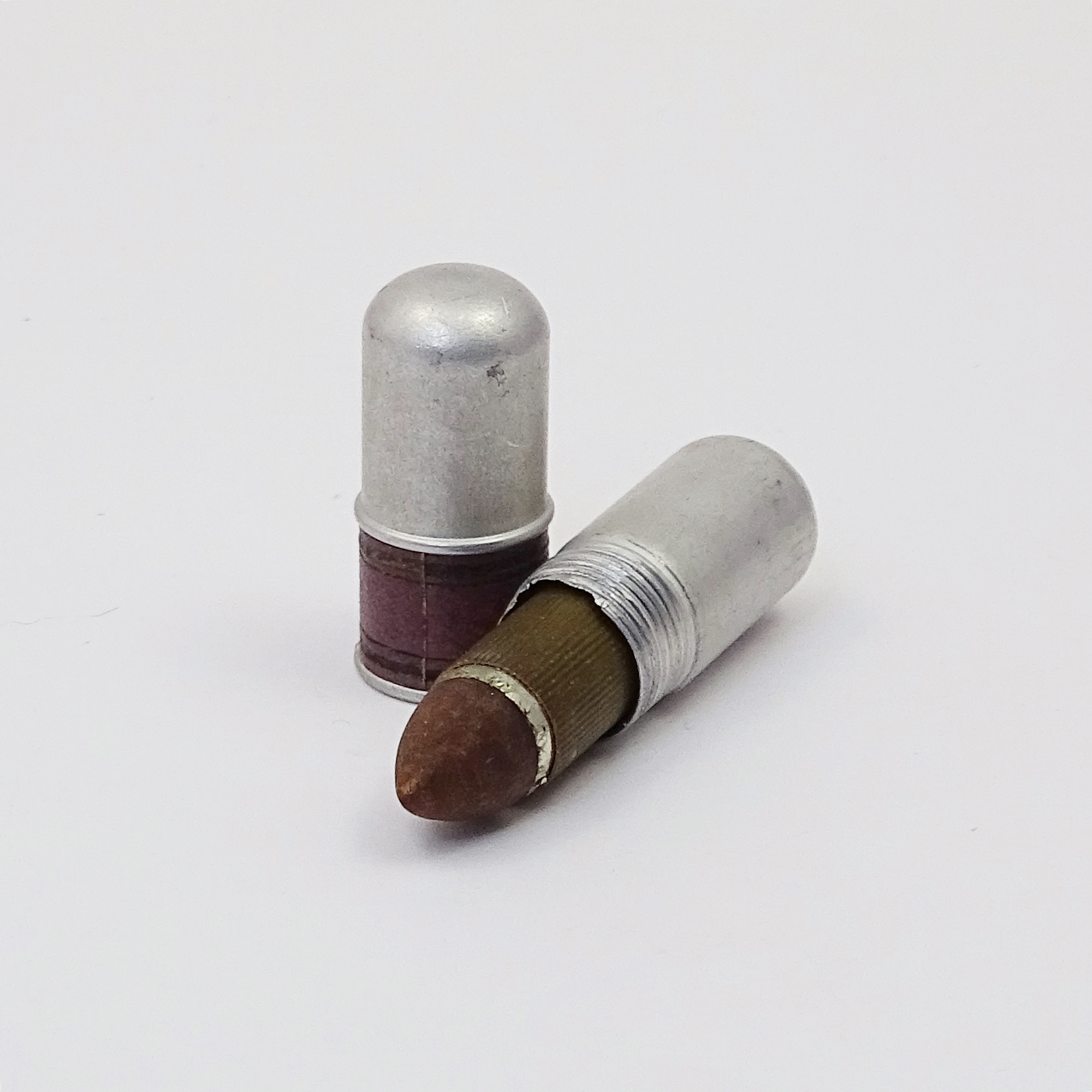 Solid perfume in form of a lipstick in a metal holder with a stripe of purple leather bearing the word “Violette”.