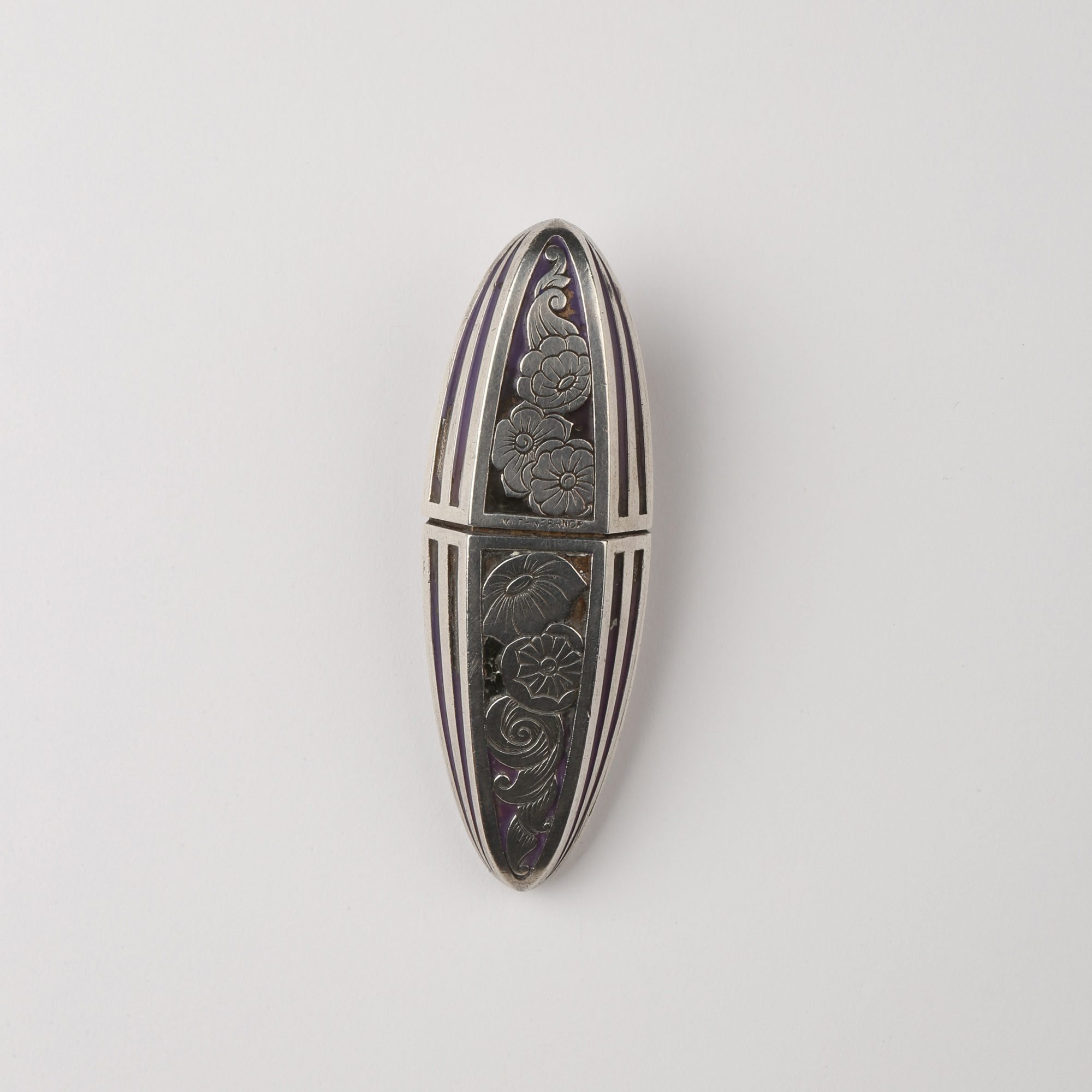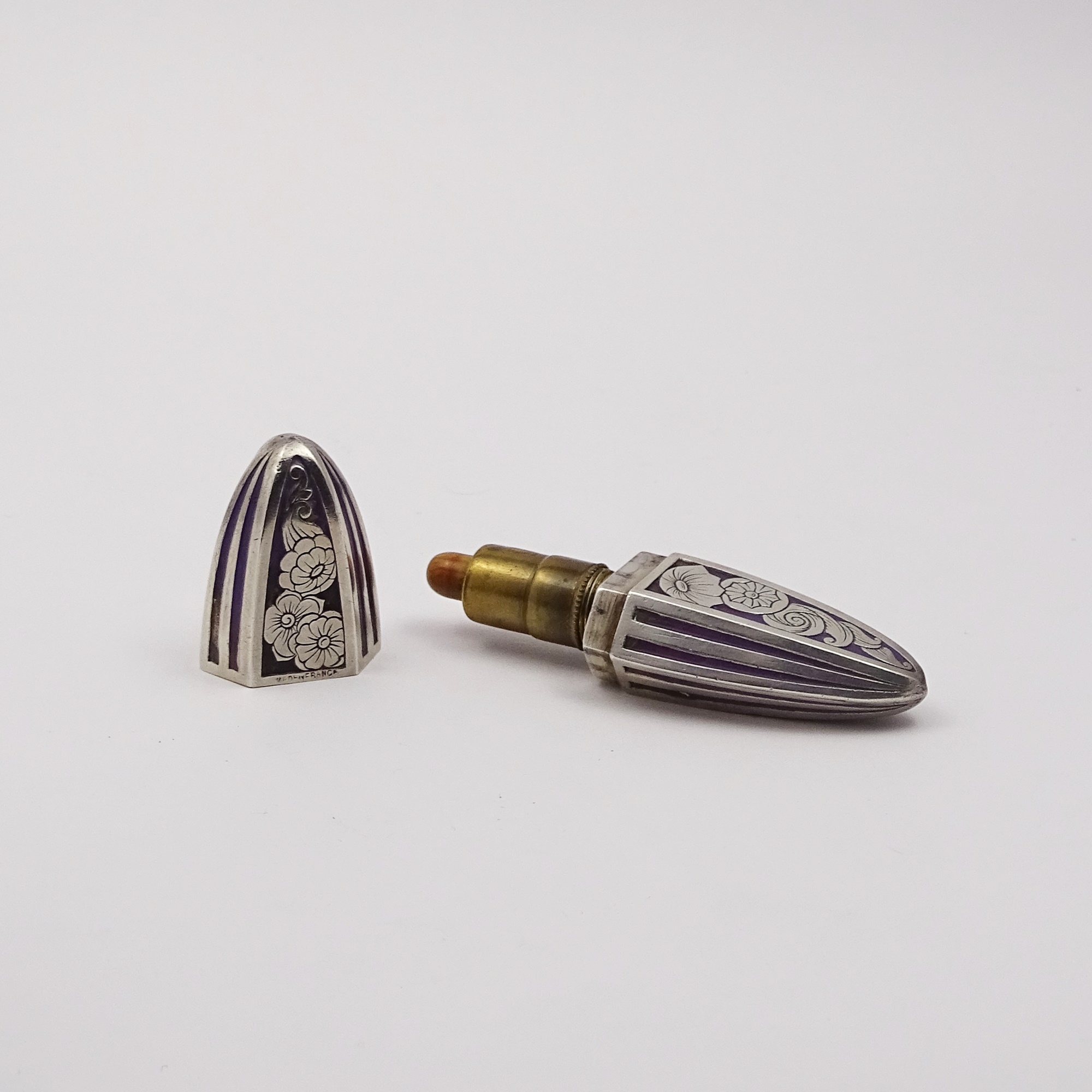 Silver and enamel scent bottle with floreal motifs and stripes. It opens to reveal a brass mount marked “Bijou”, an illegible mark and the word “Brevete”. It ends with a little plunger plastic button. On the other side is it possible to read “Made in France”.