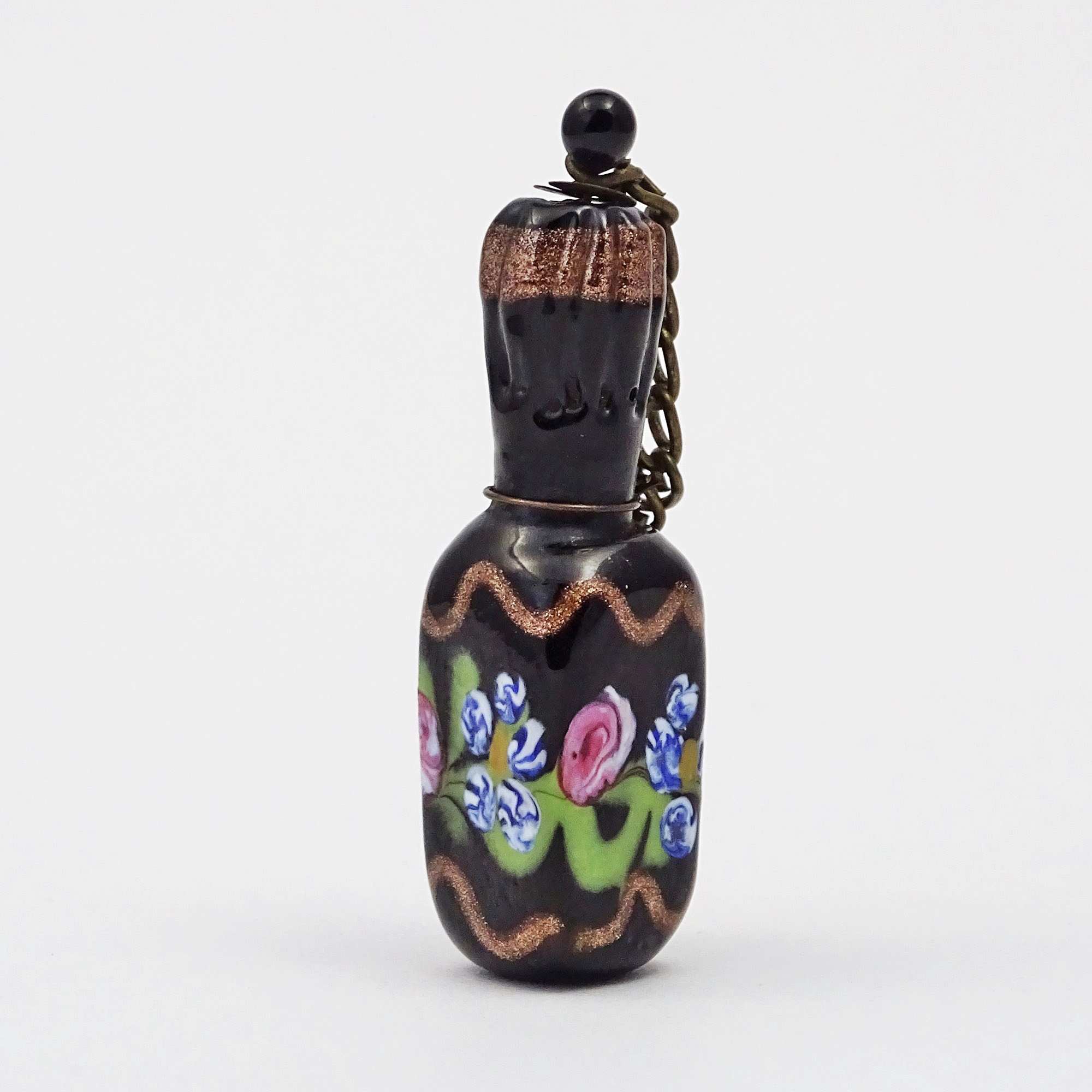 Square scent bottle in a black glass lampwork bead with aventurine waves, roses and five petals flowers