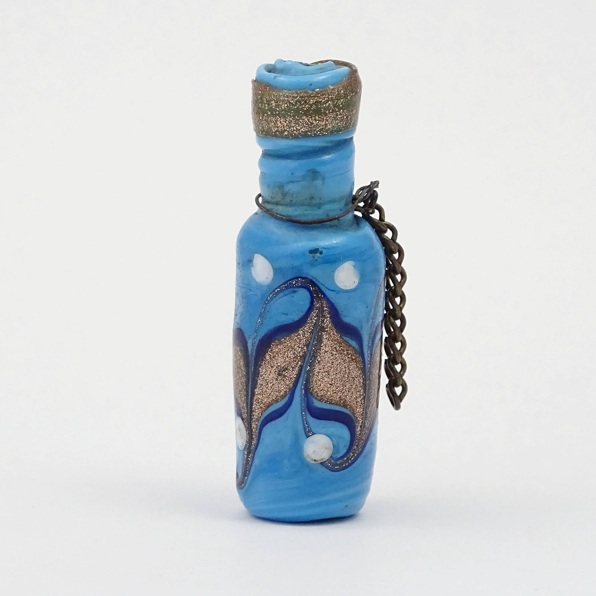 Home » Collection » Square scent bottle in a blu glass lampwork bead with aventurine leaves and white dots