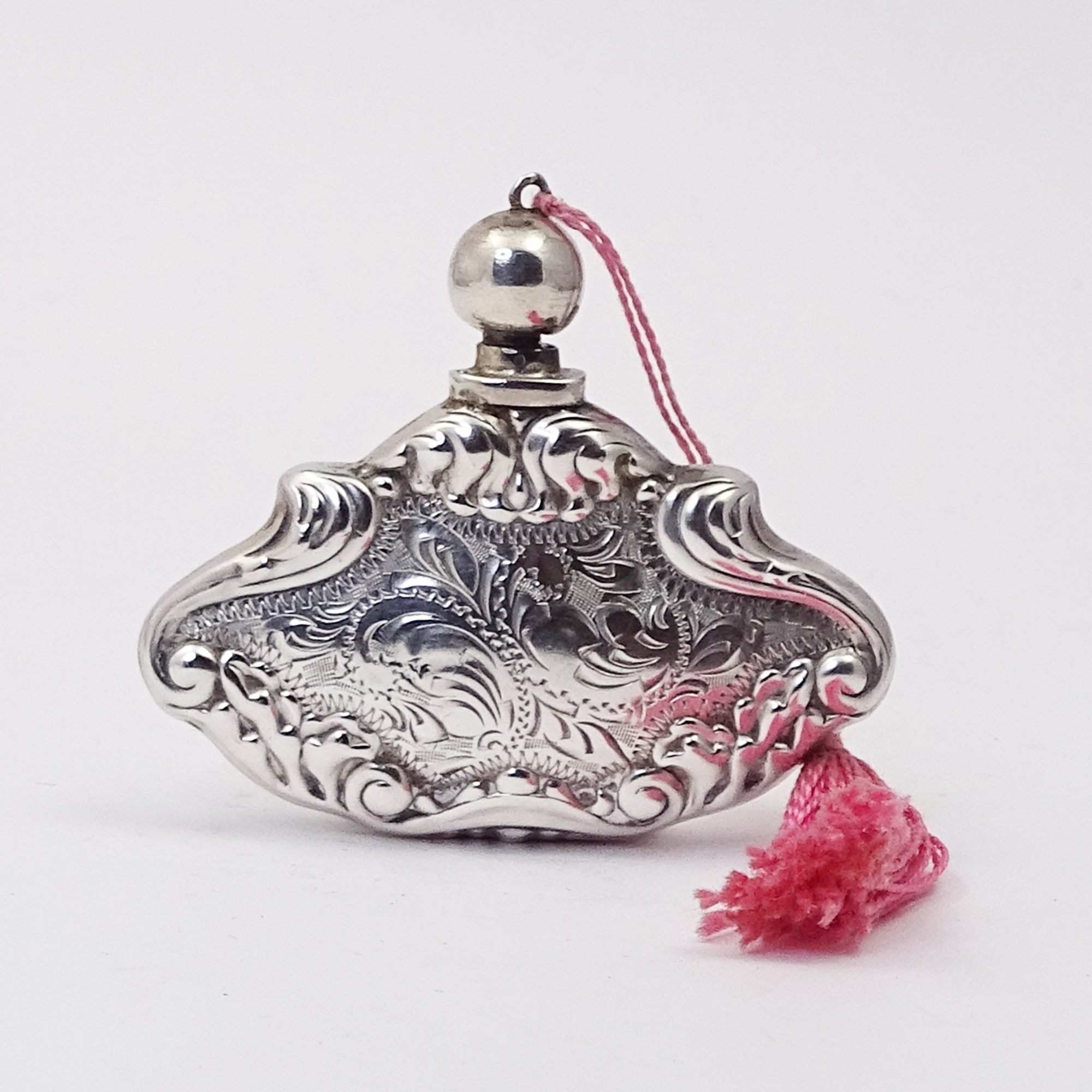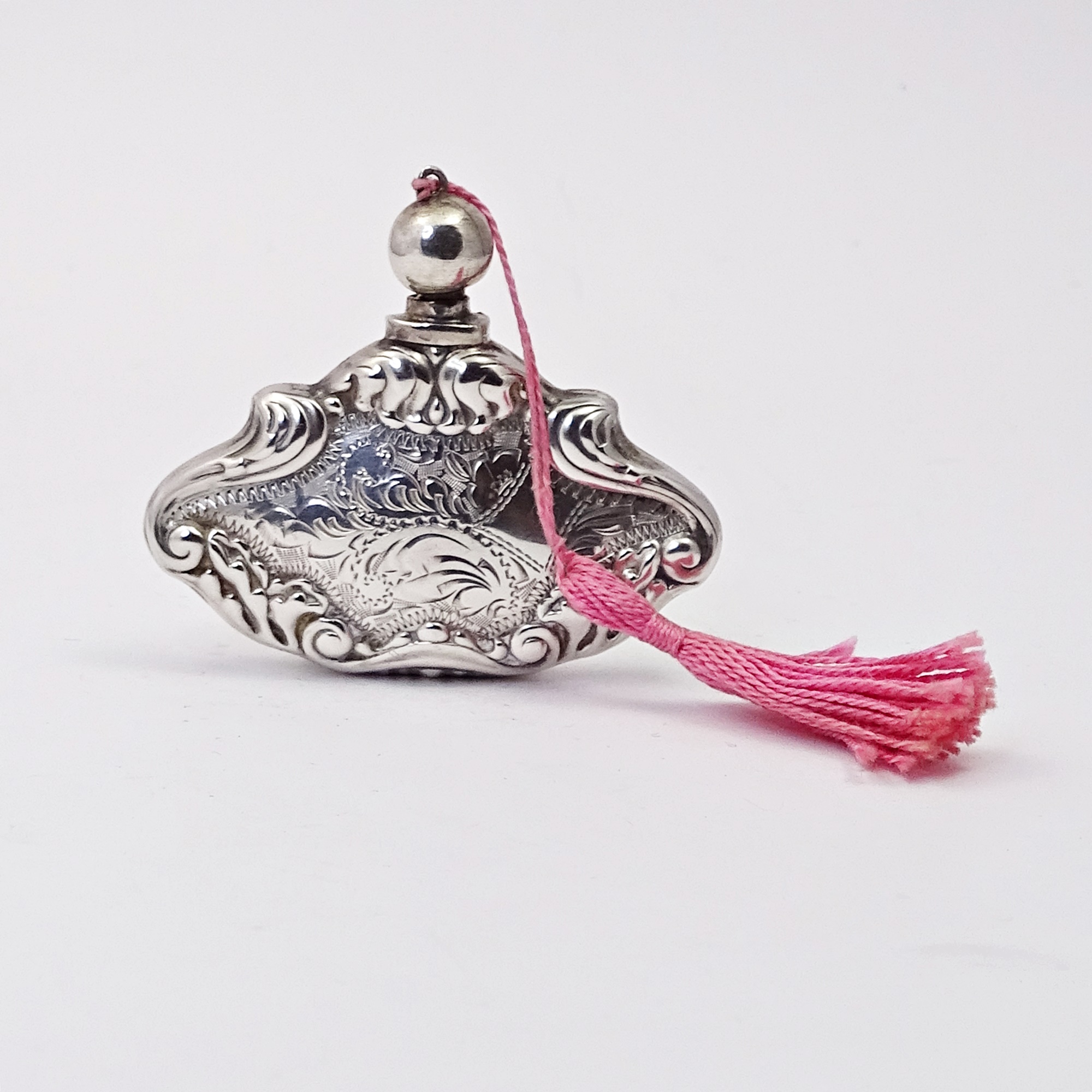 Silver scent bottle with rich embossing and chiselling decoration. Globular cap with silver wand and suspension ring, to wear like a pendants. Original pink tassel. Full hallmarked, with pre1921 marks.