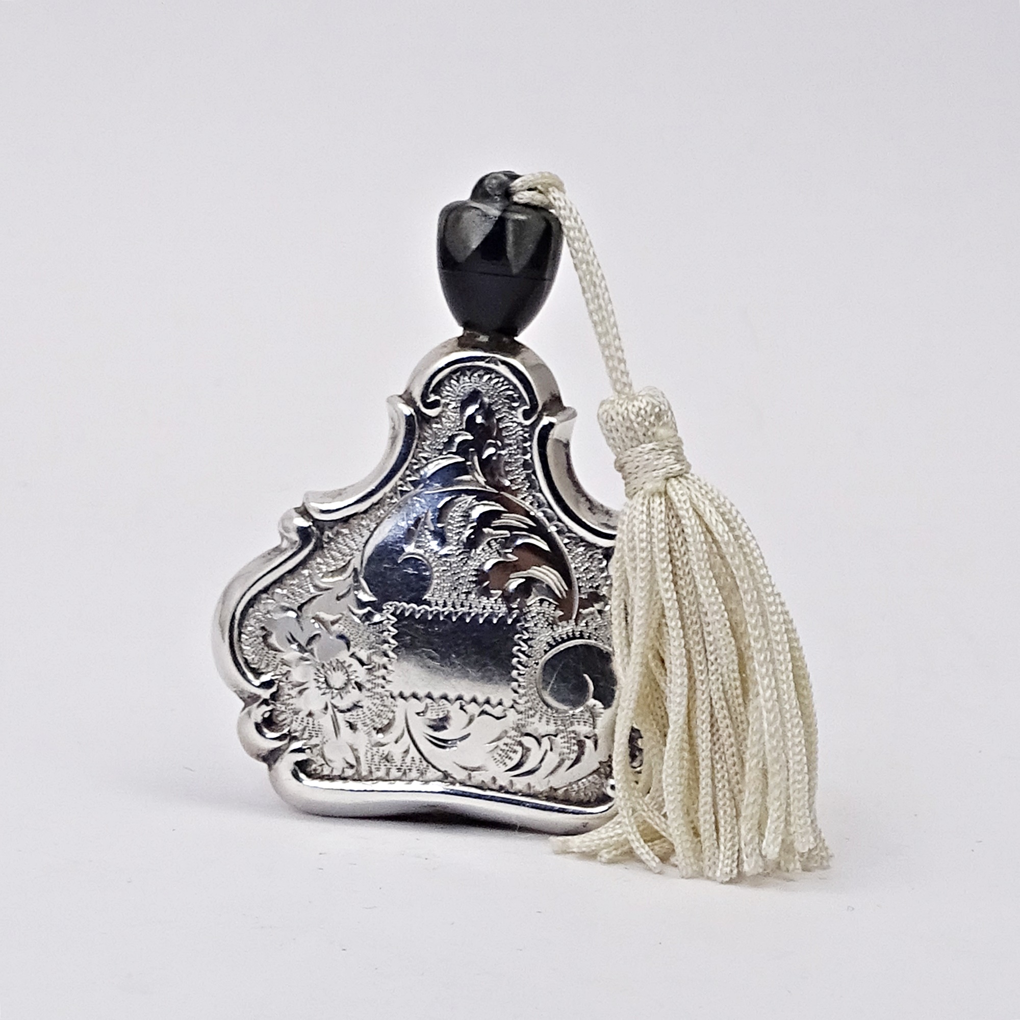 Stamped silver scent bottle of baroque forms with scrolls edge, floral and foliage decor. On the front, space for the monogram. Screw black Bakelite cap with metal rod, suspension ring and white tassel. Silver marks.