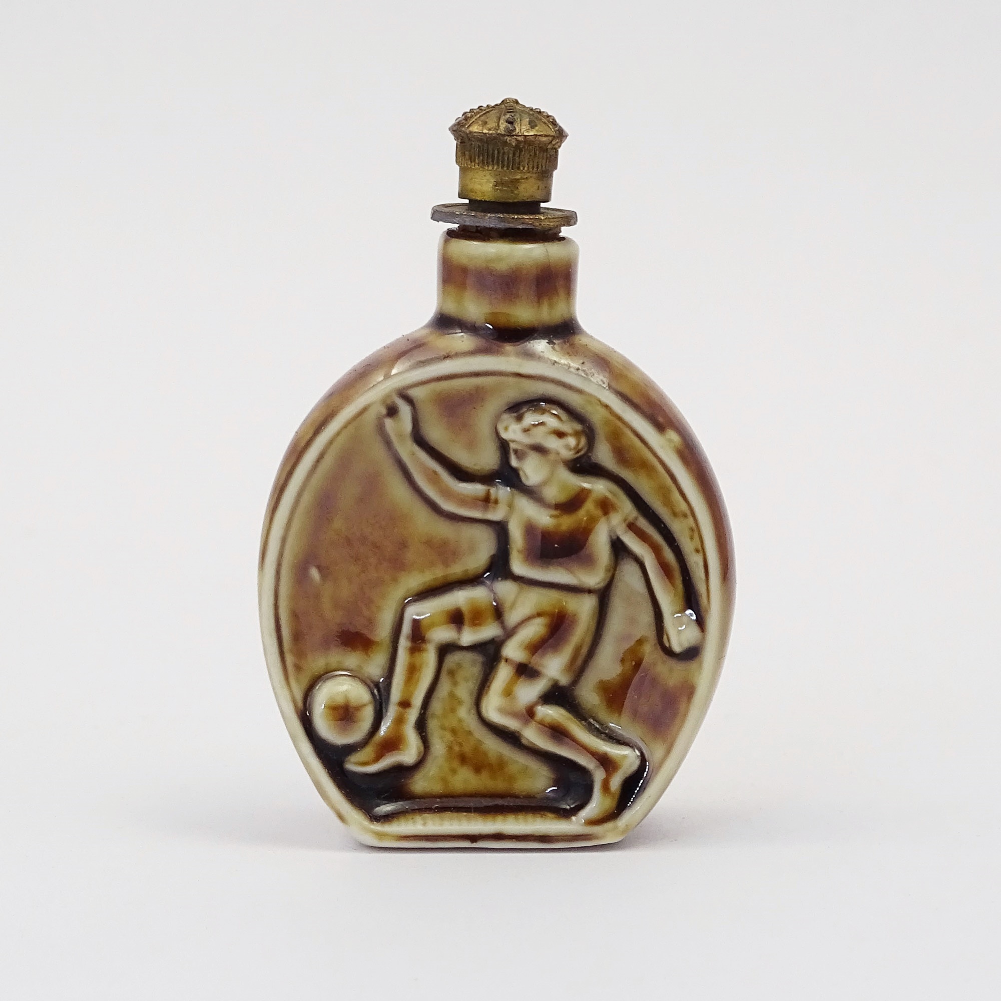 Tan porcelain scent bottle showing a boy playing football. Gilt metal crown top. Model n° 2145 of the serie dedicated to sports by the Schafer&Vater.