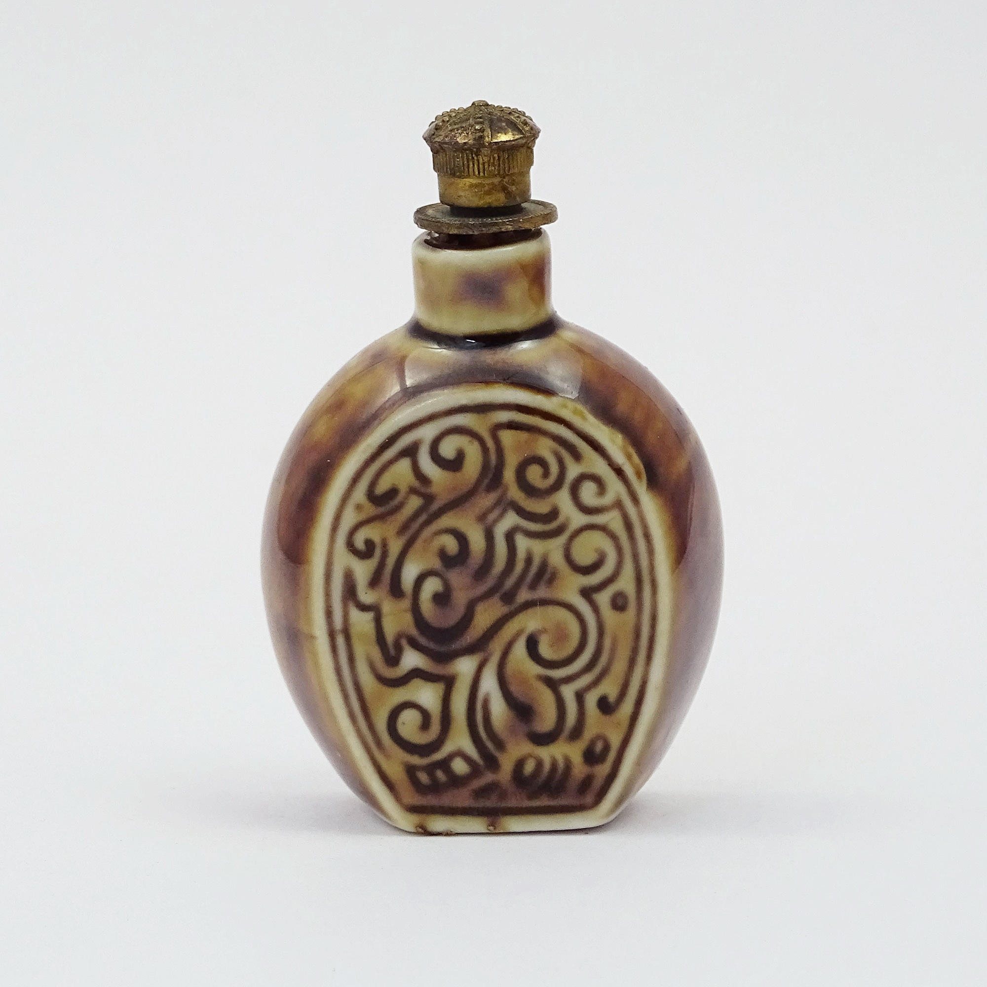 Ivory bottle with rich carved decoration of foliage and acorns, partially eroded by time. On the front the profile of a man with a...