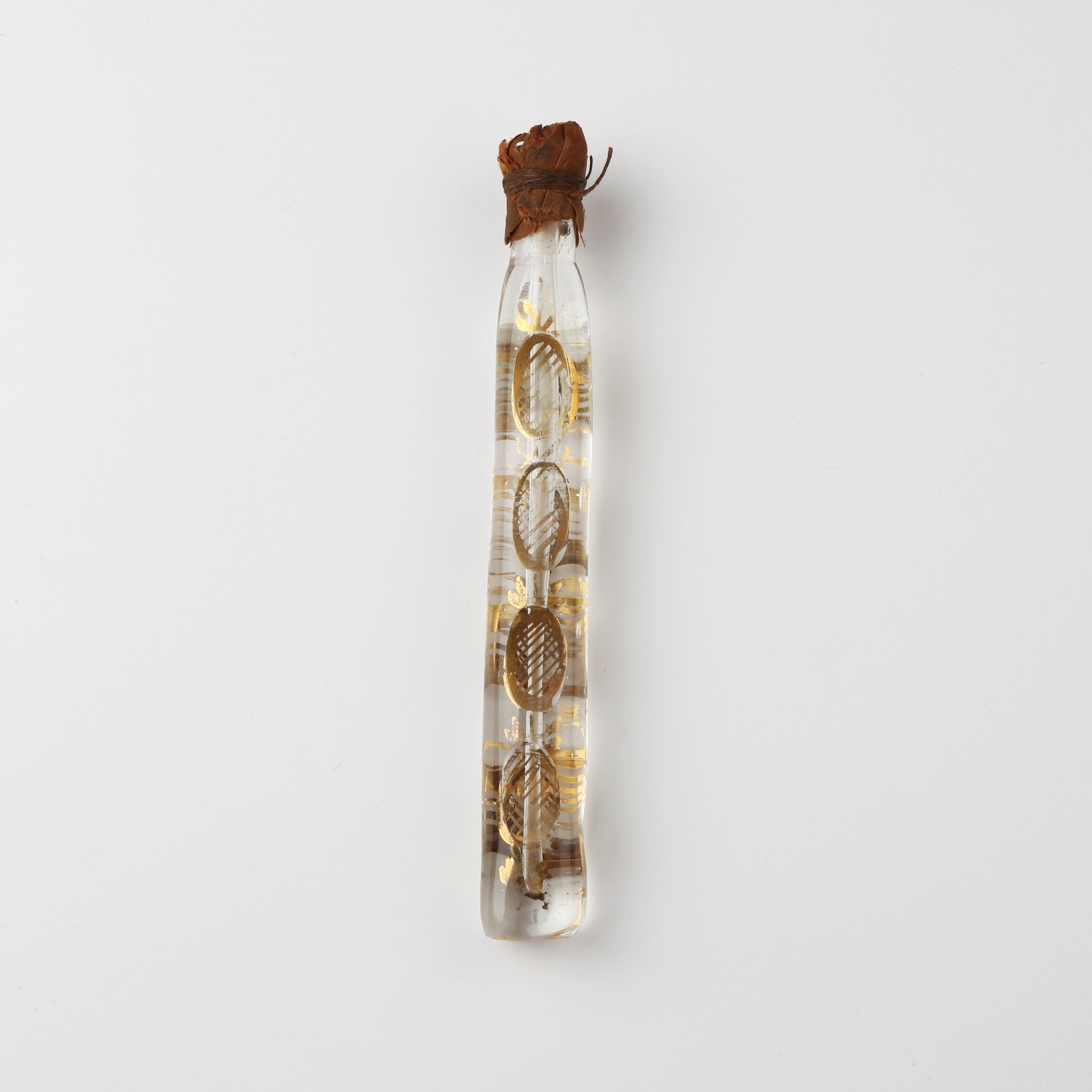 Throwaway scent bottle made of clear glass, decorated with hand-painted gilt striped oval shapes called ‘thumbprints’. Tiny glass stopper. Original stopper covered with parchment and string.