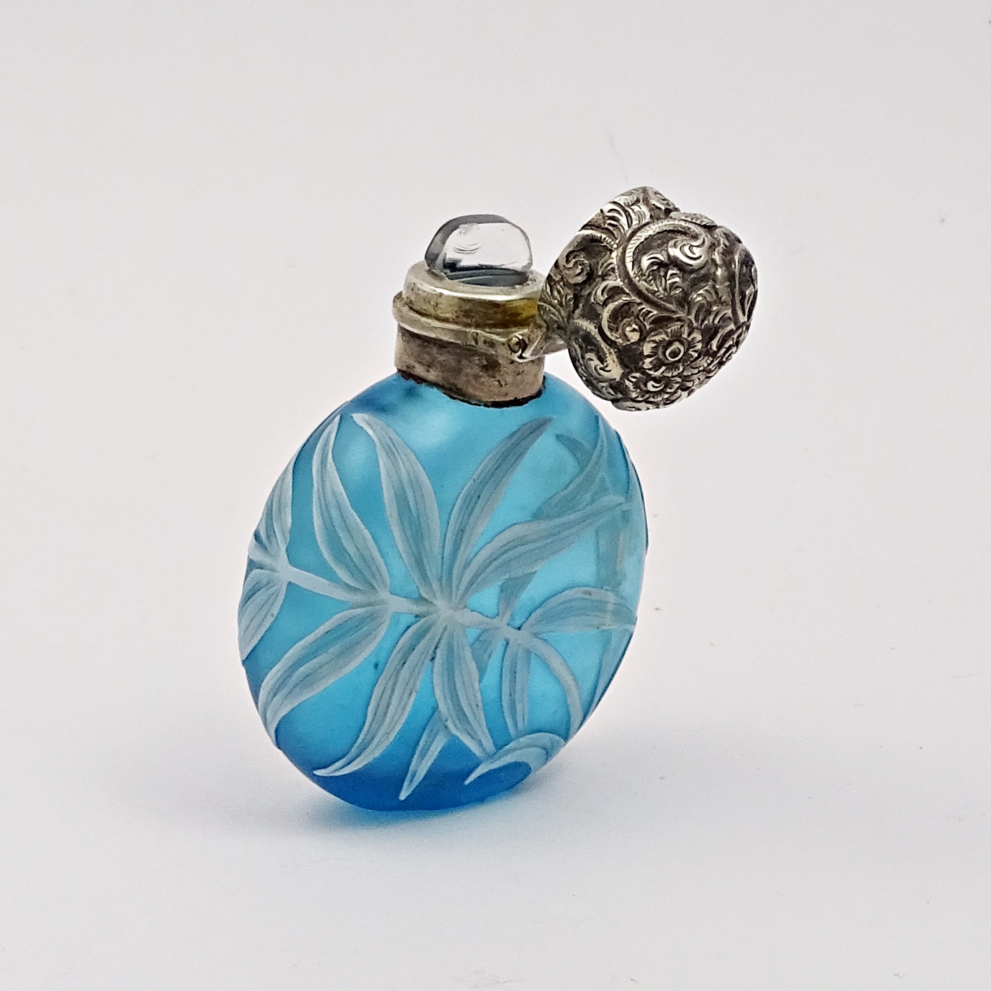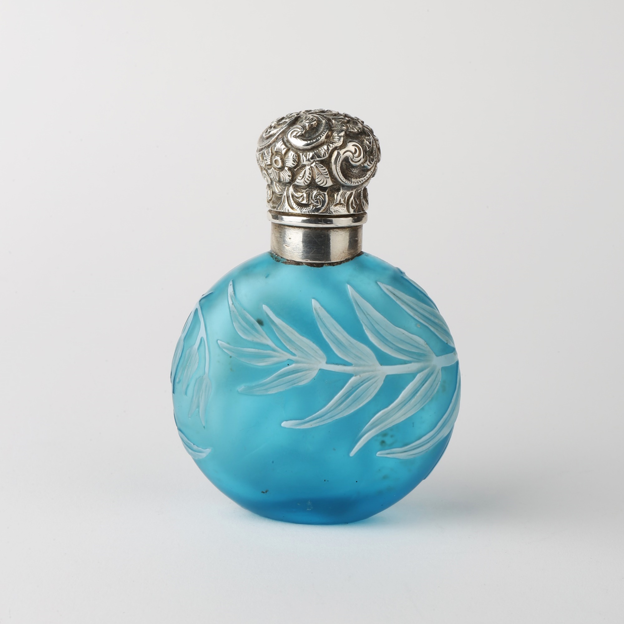 Turquoise Stourbridge cameo glass scent bottle. The front shows a leaves branch that continues to the back. Silver mount with illegible marks. The silver repousse lid has no marks. Round inner glass stopper.