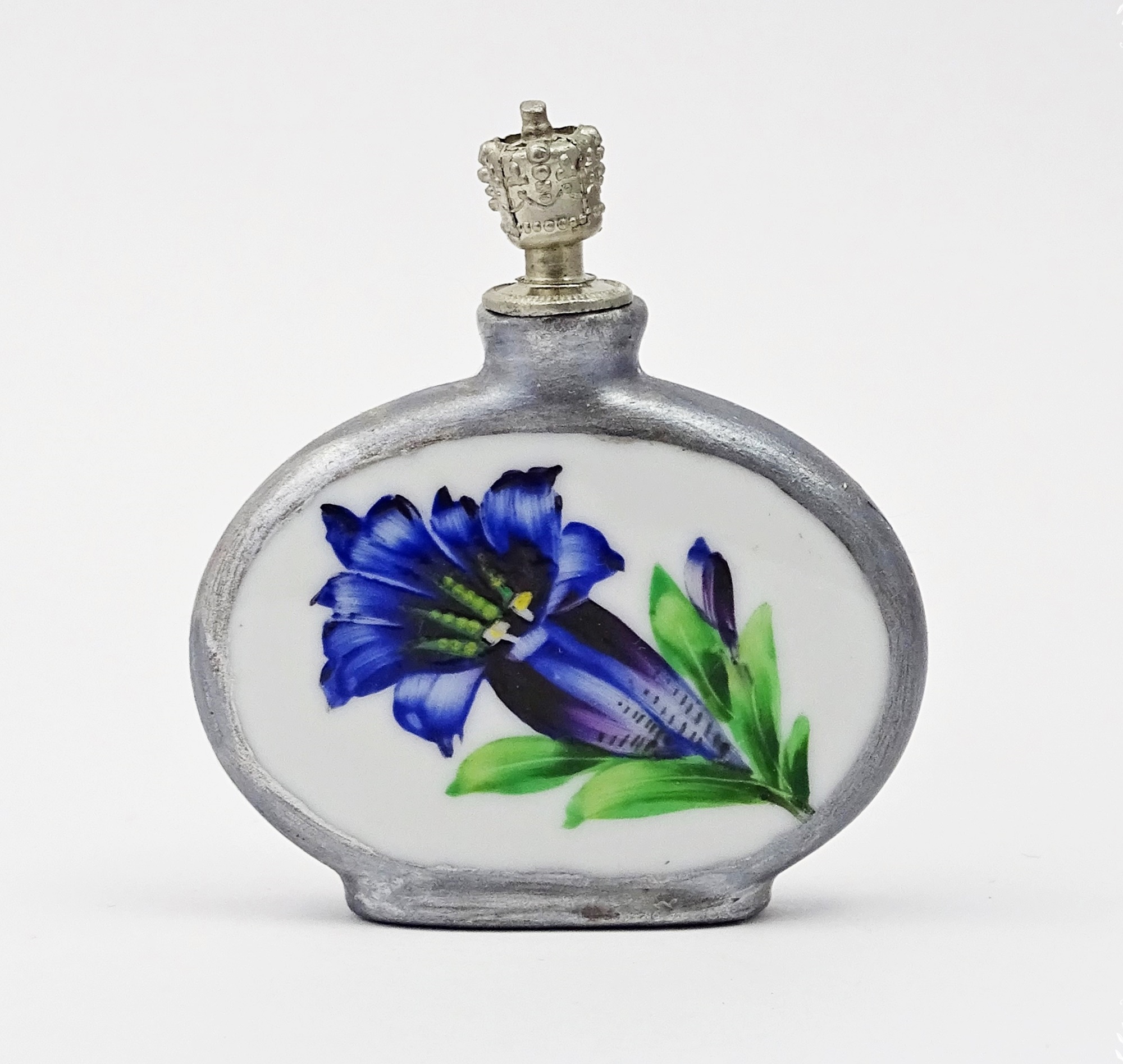 White enamelled porcelain scent bottle with a gentian painted on one side and an edelweiss on the other. Silver rimmed. Metal crown cap.