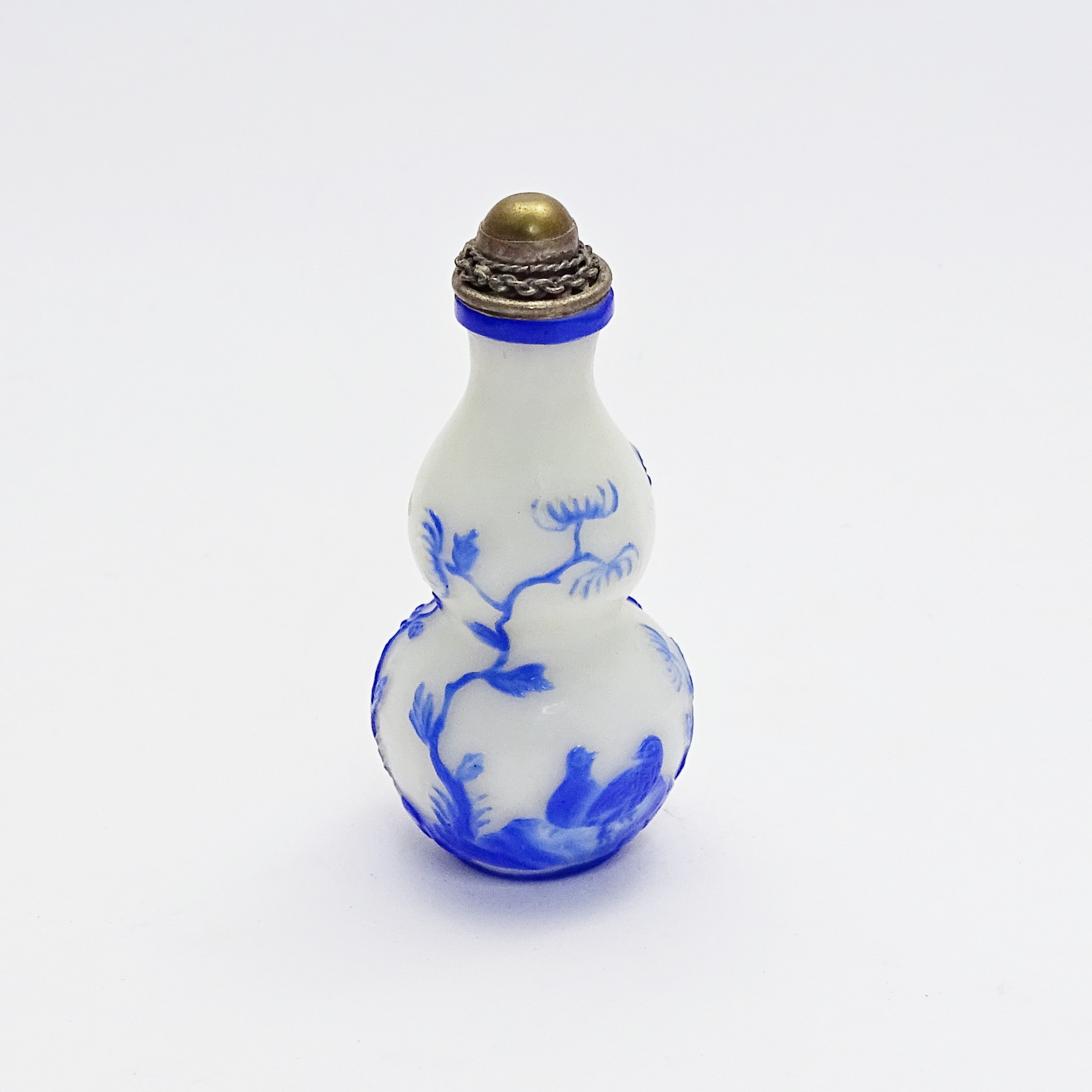 Eight-shaped scent bottle in white Peking glass with a blue decor of flowers, trees and birds. Metal cap.