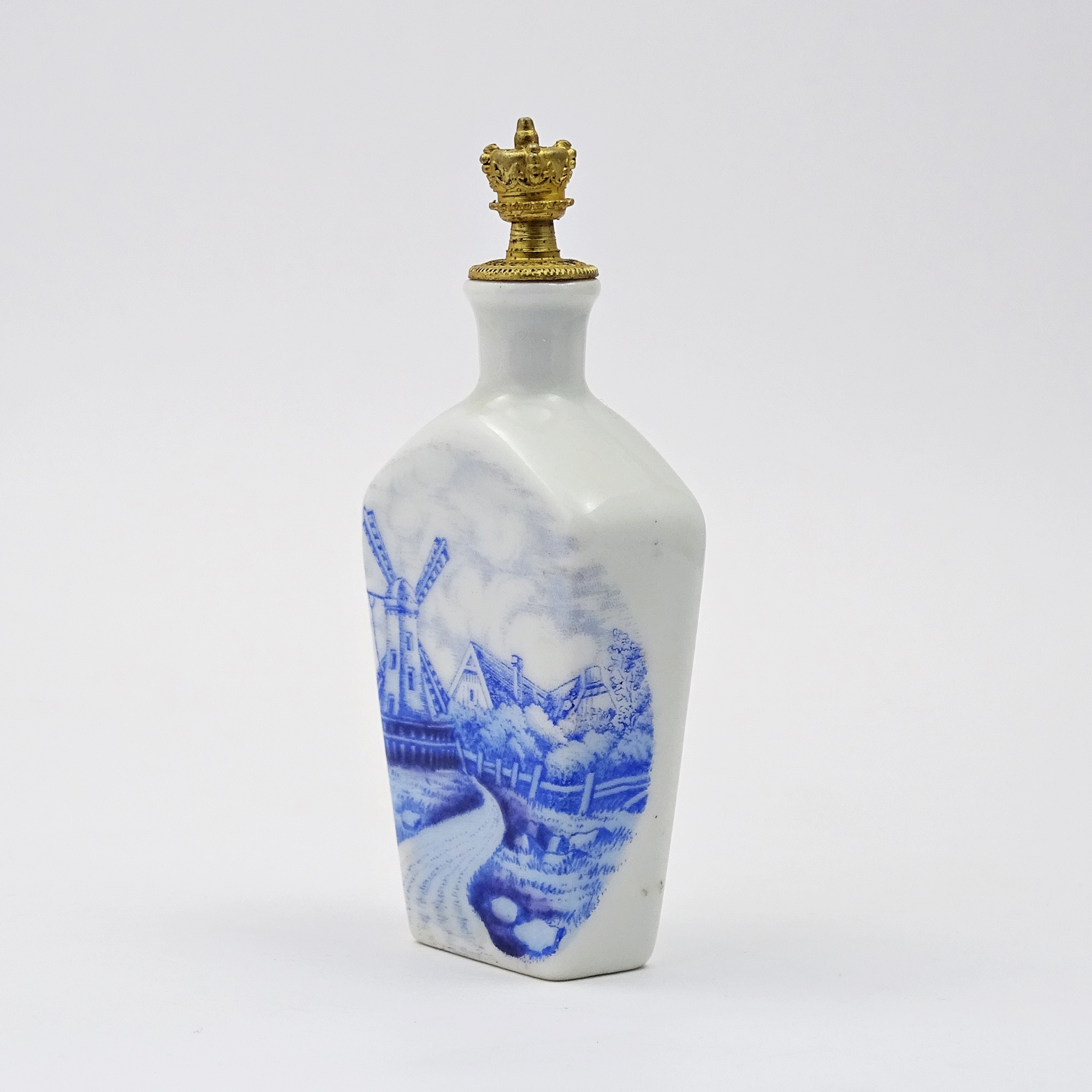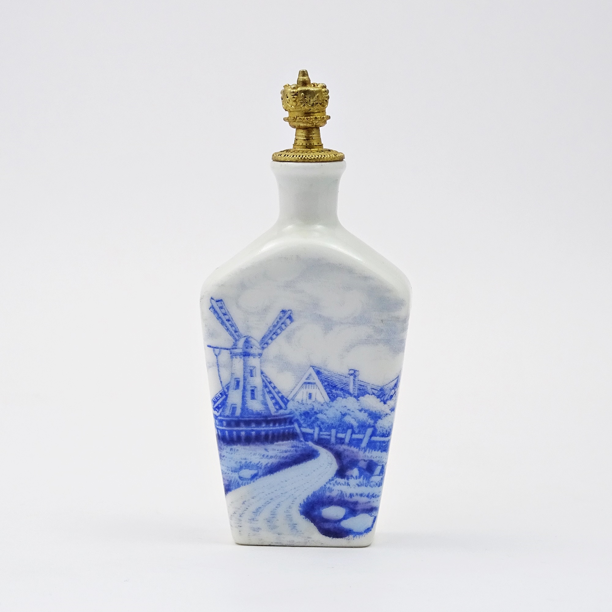 White porcelain scent bottle showing a Dutch landascape in blue. Sprinkler crown top in gilt metal, marked, for the colognes of the Boldoot Company of Amsterdam.