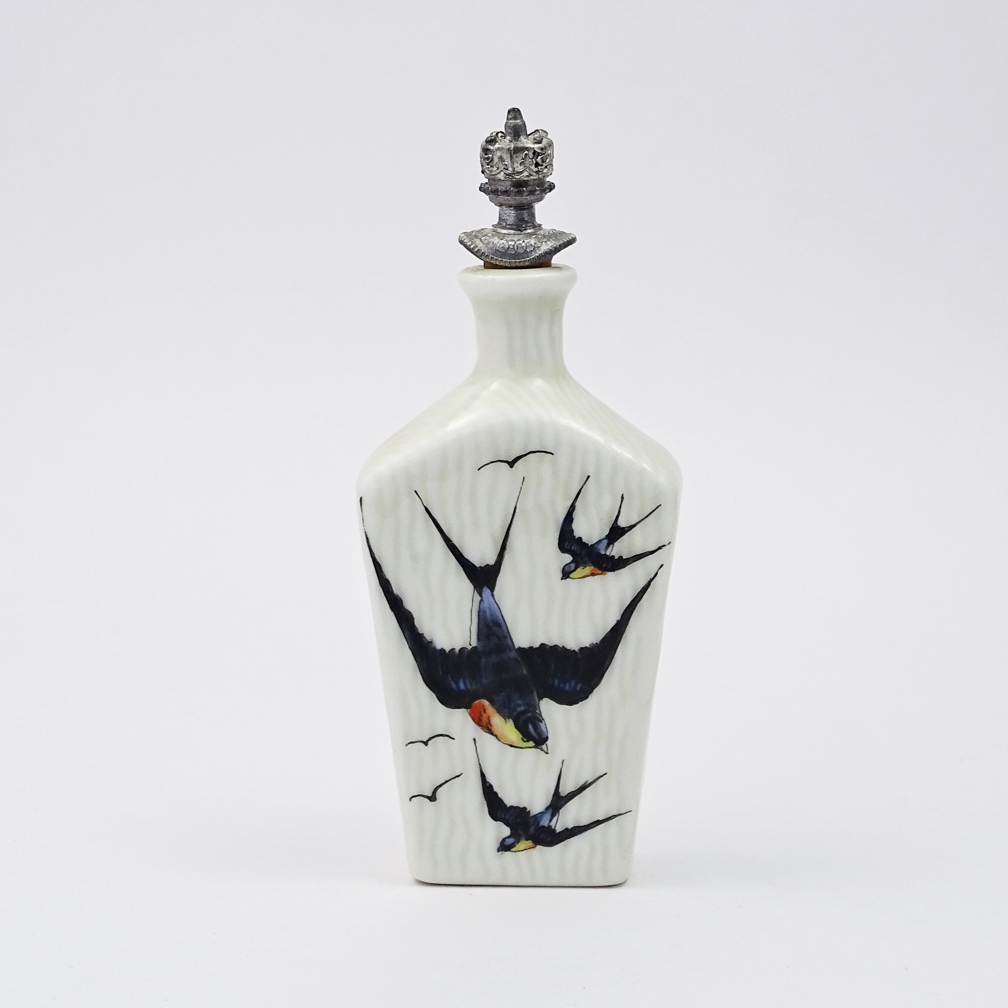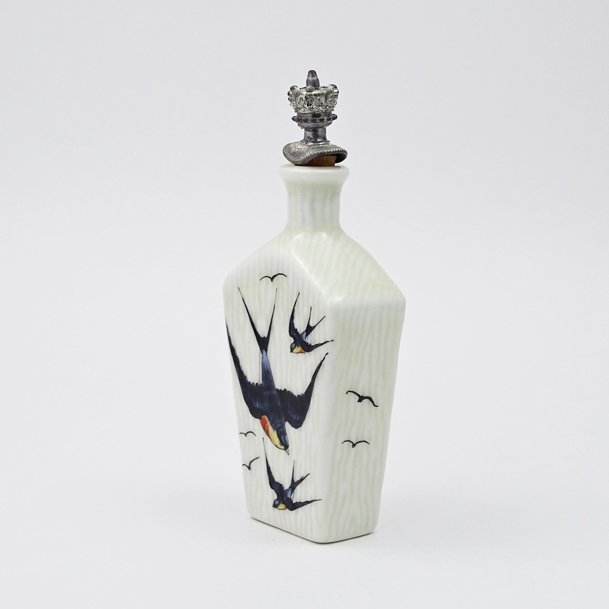 White porcelain scent bottle showing a flight of swallows. Silvered and marked sprinkler crown top used by the Boldoot Company of Amsterdam for their colognes.