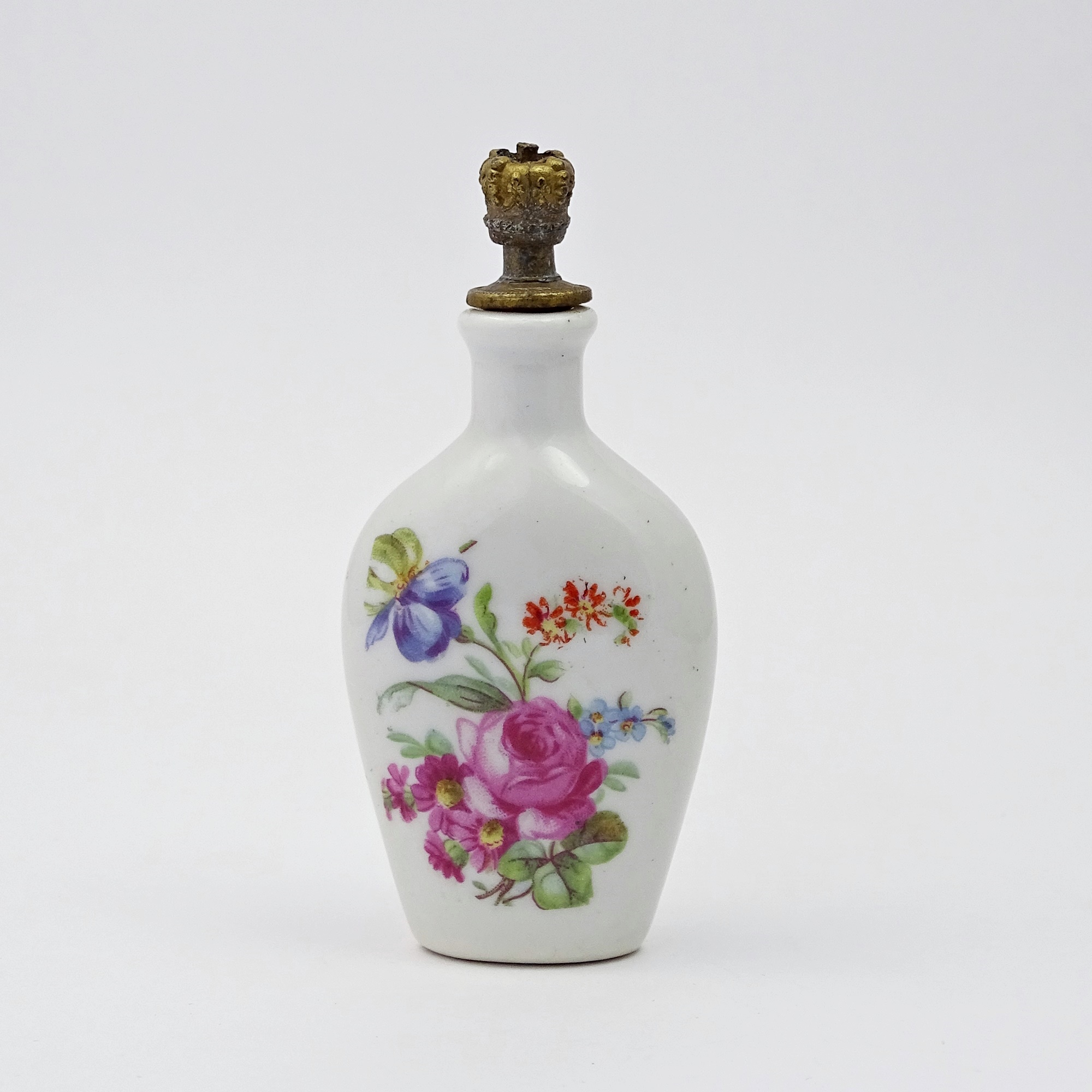 White porcelain scent bottle with a transfer showing a bunch of flowers. The back side is white. Gilt metal crown top. It could have been used for the colognes of the Boldoot Company of Amsterdam.