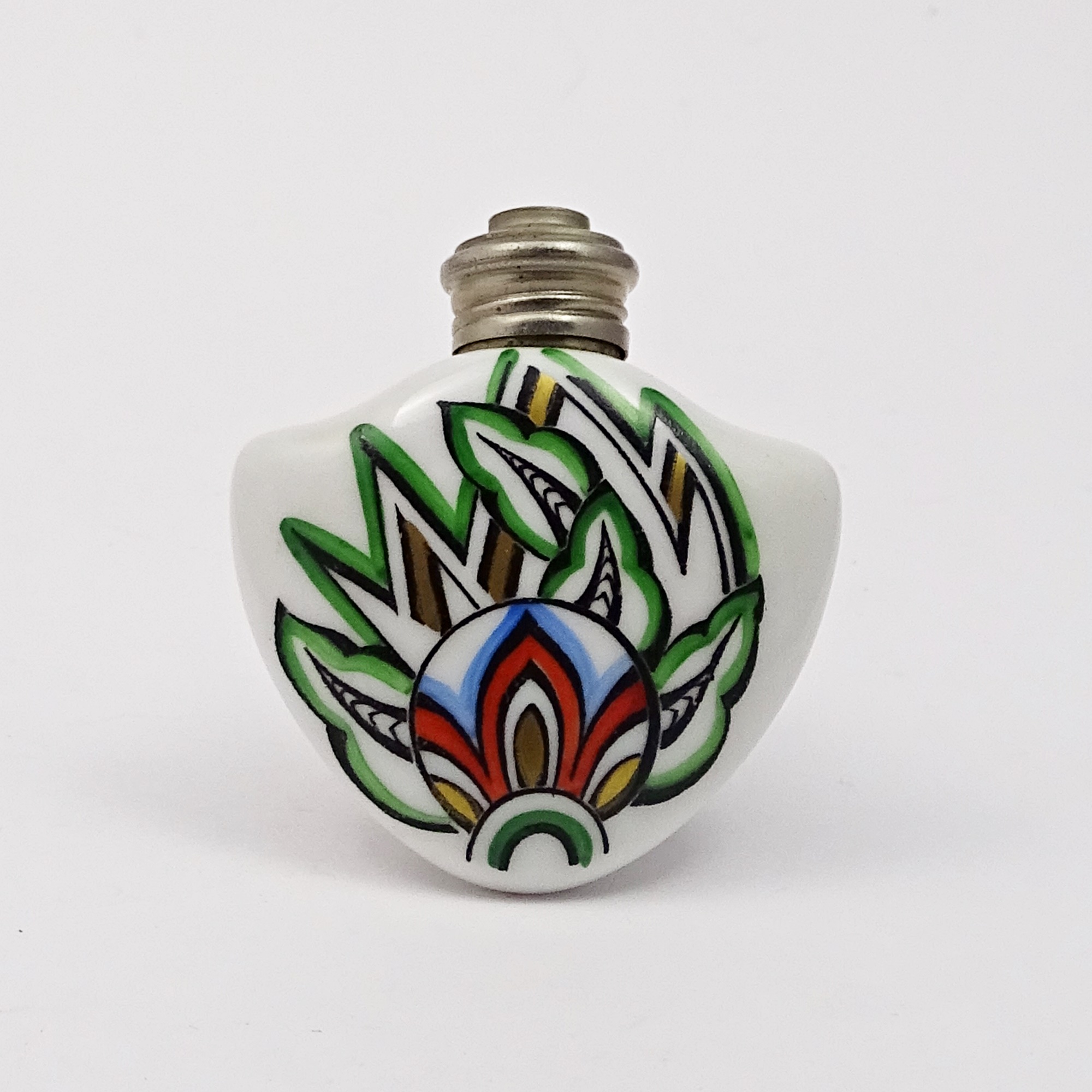 White porcelain scent bottle with an abstract decor. Metal screw cap.