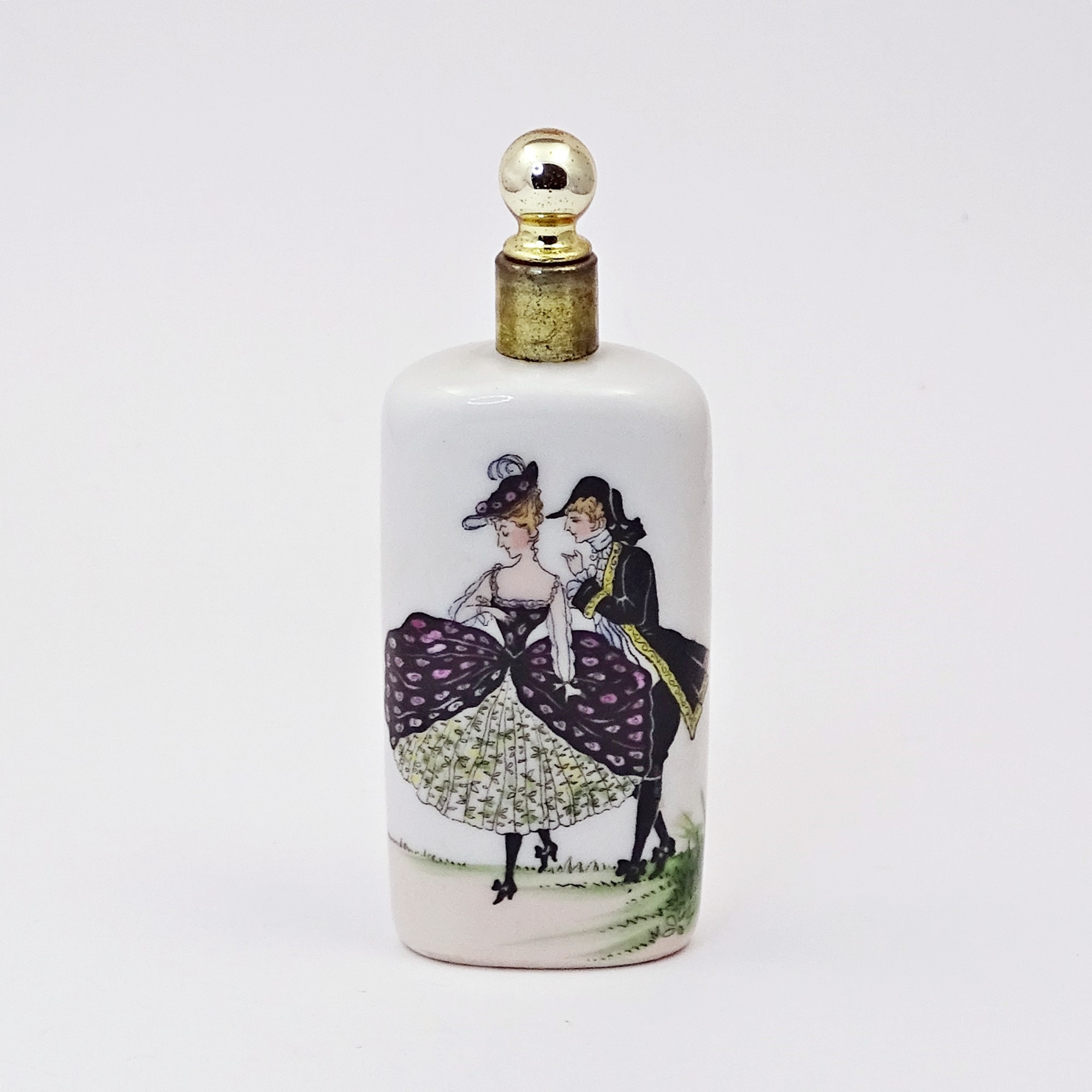 White porcelain scent bottles with a decal showing a couple in fancy dresses 1