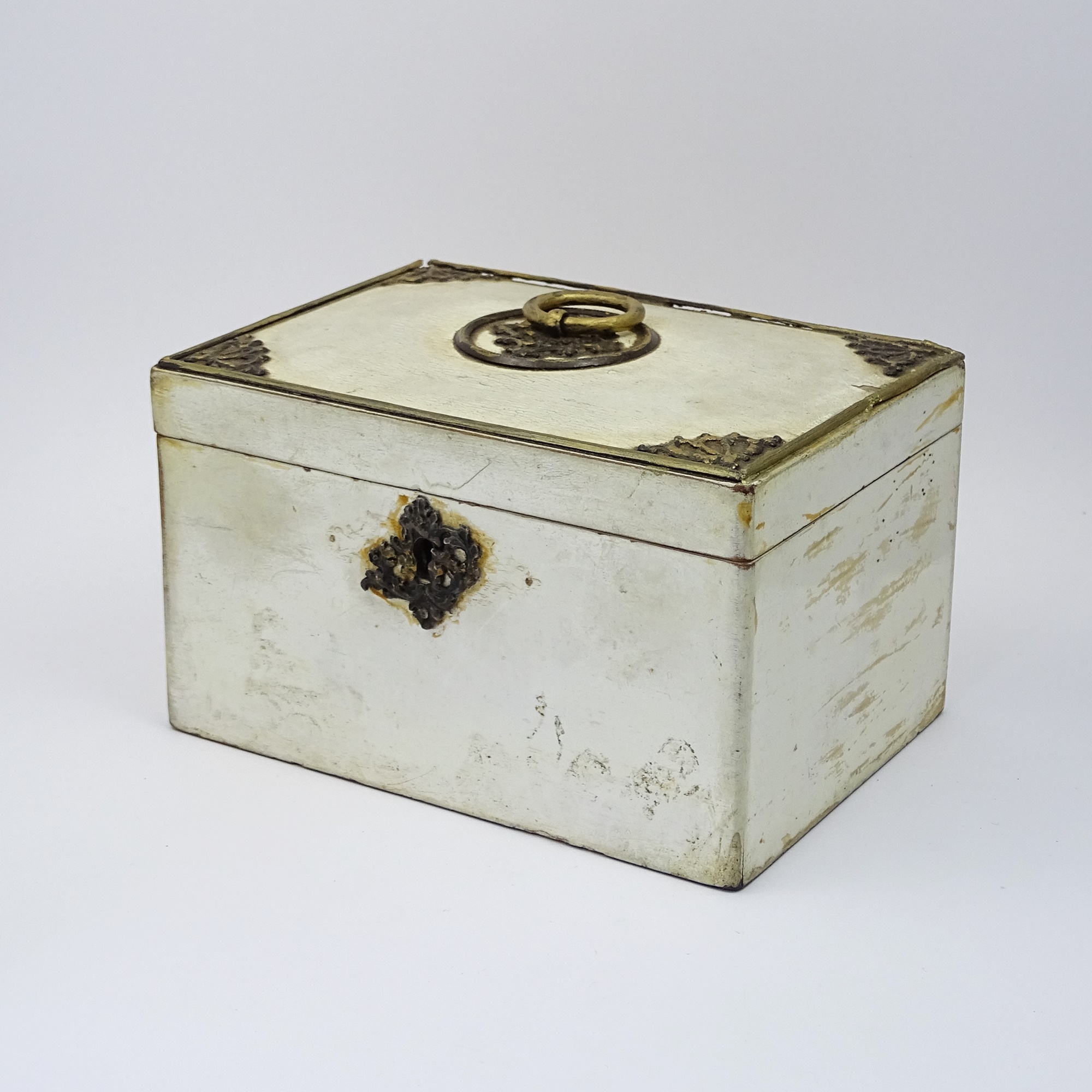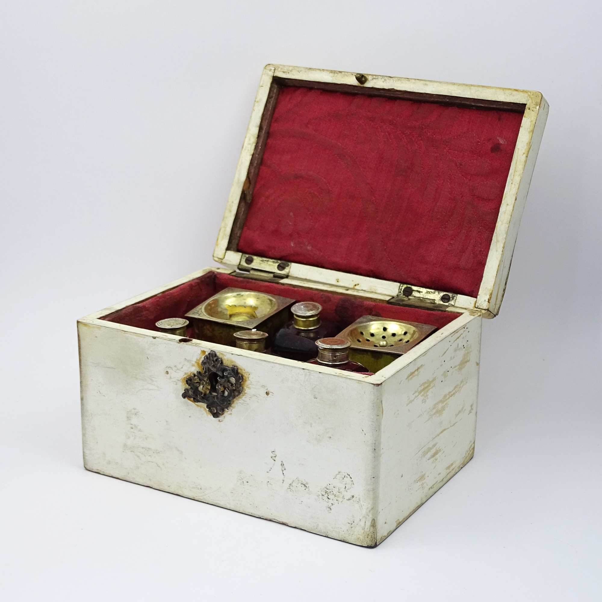 Wooden box probably later painted in white with a inner lined in red brocade. It contains four scent bottles in red glass of slightly diferent sizes with silver cap engraved with various circular motives, an inkwell made in wood and covered in olive green satin with silver cap, a sand box made in the same way with perforated silver top and an engraved silver letter opener.
