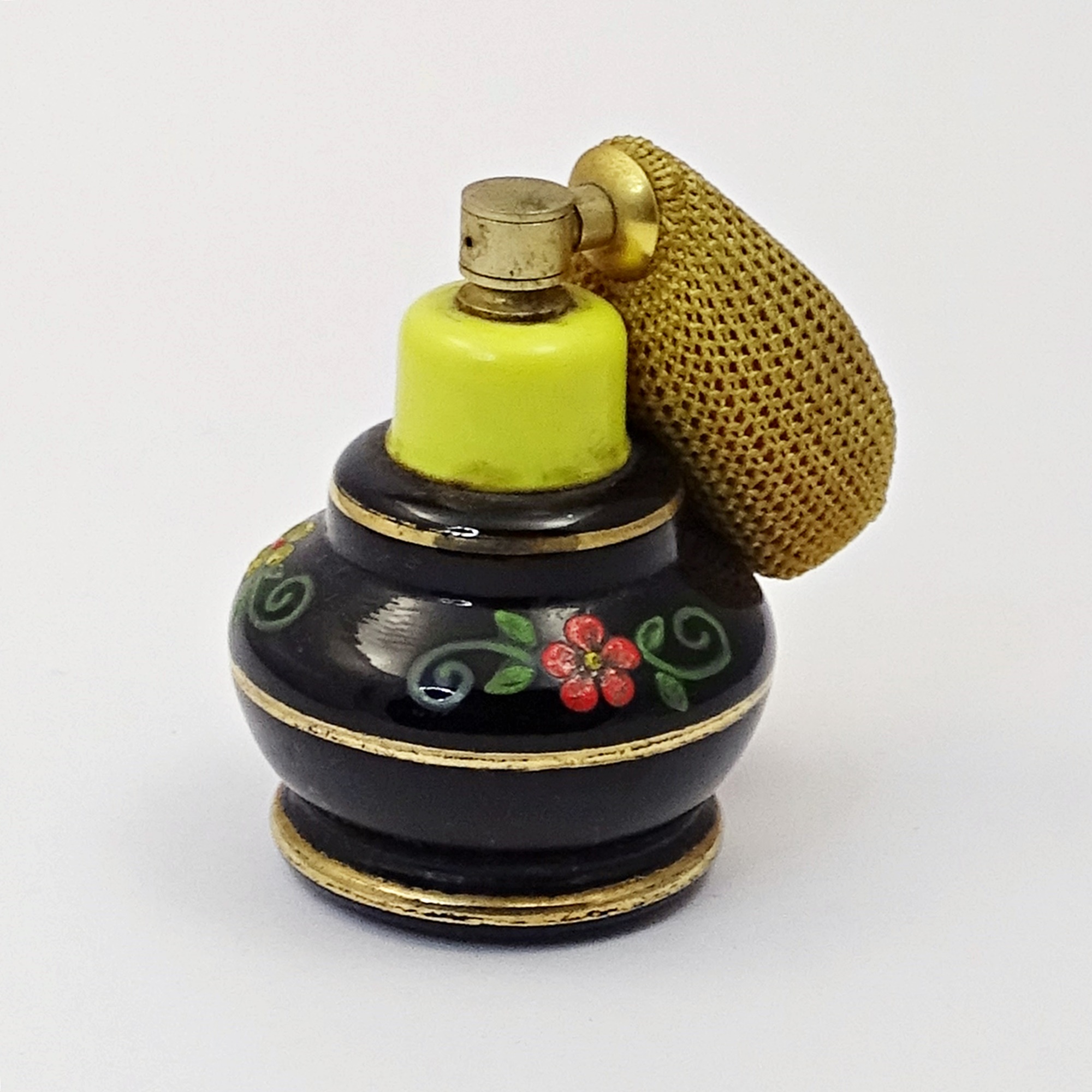 Home » Collection » Yellow and black porcelain atomizer hand painted with a naive floral decor.