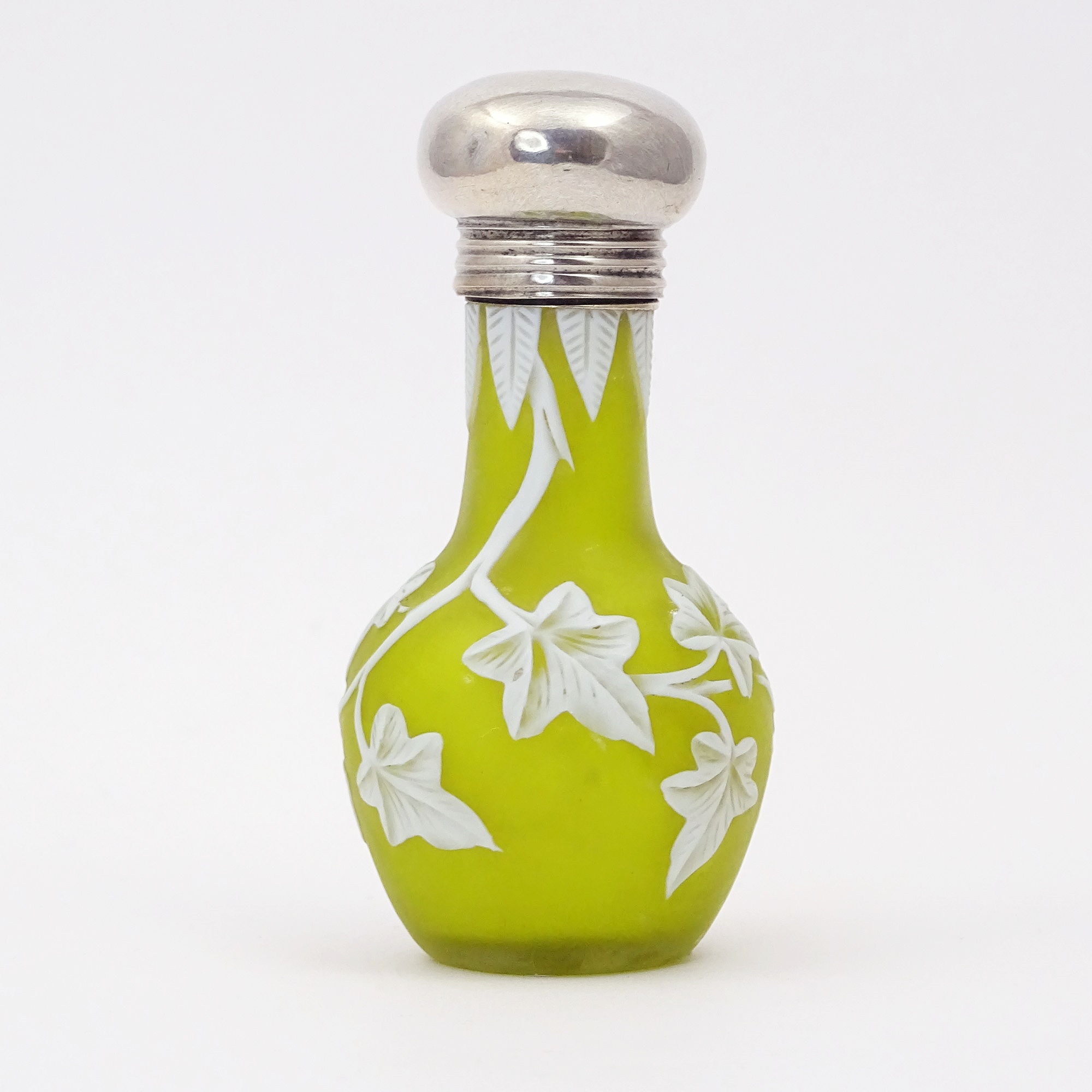 Yellow cameo glass with ivy decor. Silver screw cap marked “silver”.