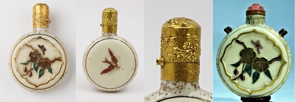 Creamware scent bottle with a relief painted decor on both sides: one with brown flowers, the other with a flying bird. These bottles were made in Japan for the foreign markets where caps where added: in this case the hinged gold cap is embossed with tiny flowers, probably made in France, giving an Art Nouveau style to the object.