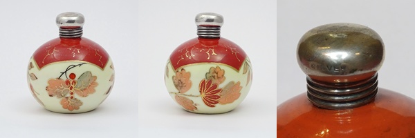 Globular orange and cream porcelain scent bottle with floral decor. Screw cap with the word “SILVER” engraved. Bottle imported from Japan.