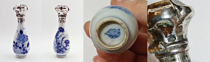 In the 18th century the blue and white porcelain scent bottles coming from China were silver mounted in the Netherlands, with characteristic big, tall cap. In particular, the town of Schoonhoven is known for its silver and therefore carries the nickname: Zilverstad (“Silver City”). Since the 17th century, silver and gold smiths have been working here. The “Artemisia leaf” or “Ai yeh” (ai ye) mark on porcelain is an underglaze blue symbol of the Kangxi period(1662-1722) of the Qing Dynasty representing the Chinese mugwort leaf. It is typically painted as a stylized leaf.