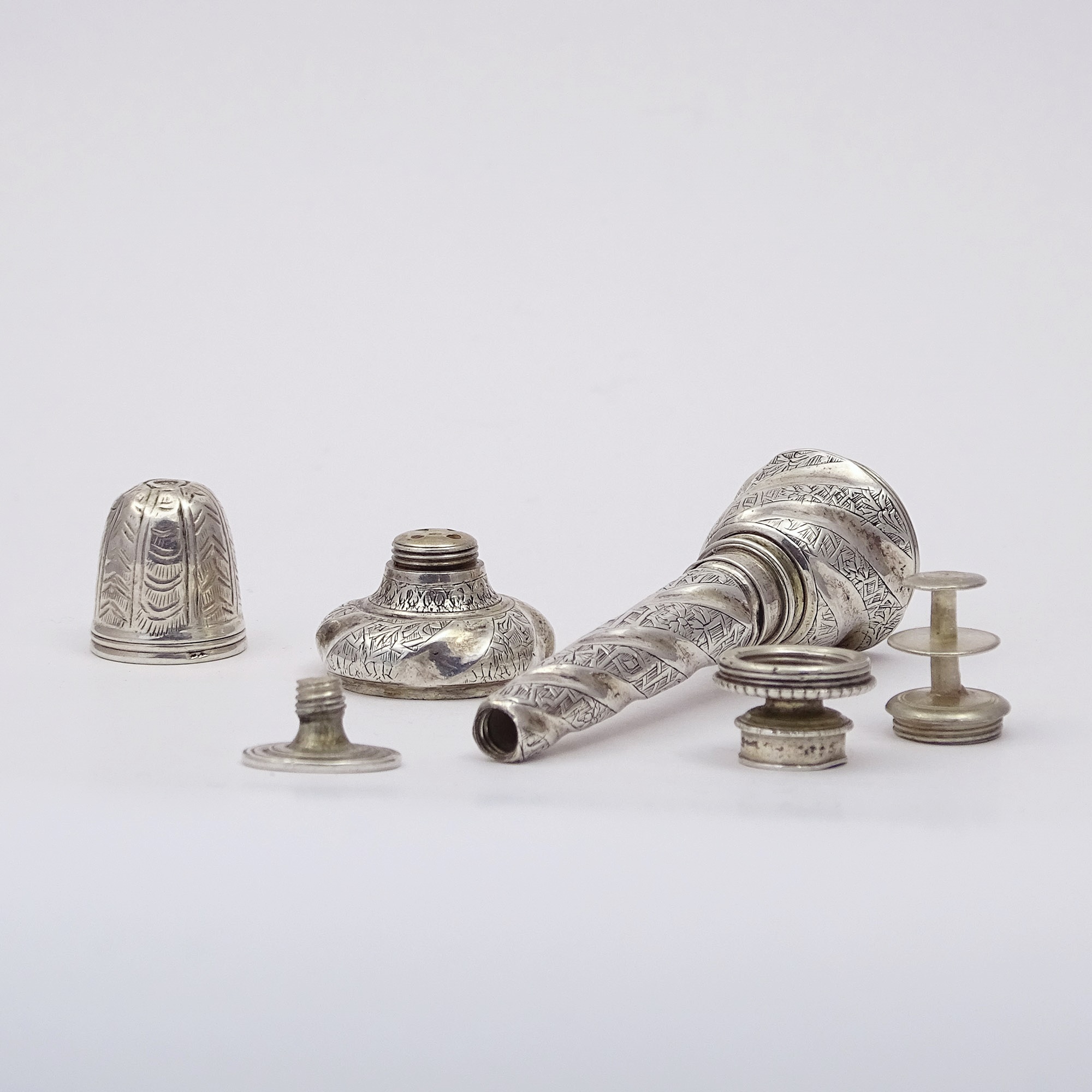 Scent-jar in closed pomander form, in silver with chased floral ornaments. It opens in four parts: the bottom contains a sponge th...