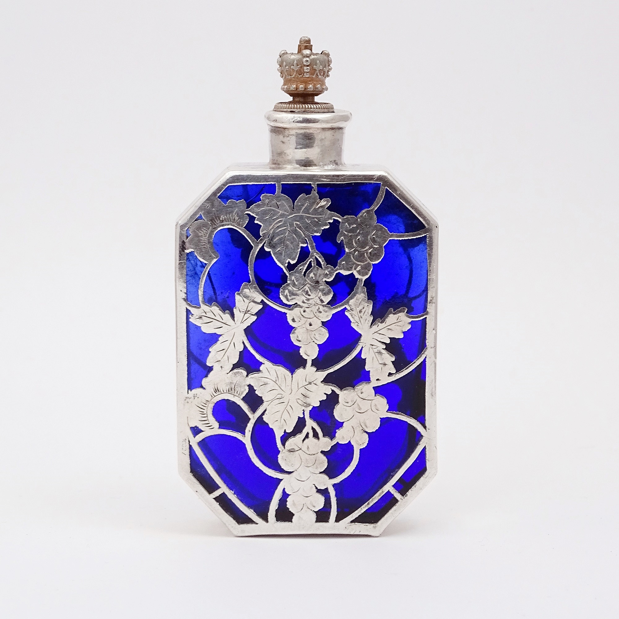 Blue glass flat-round scent bottle enclosed in a gilded silver openwork cage showing on the front Saint Ulrich (identified by the ...
