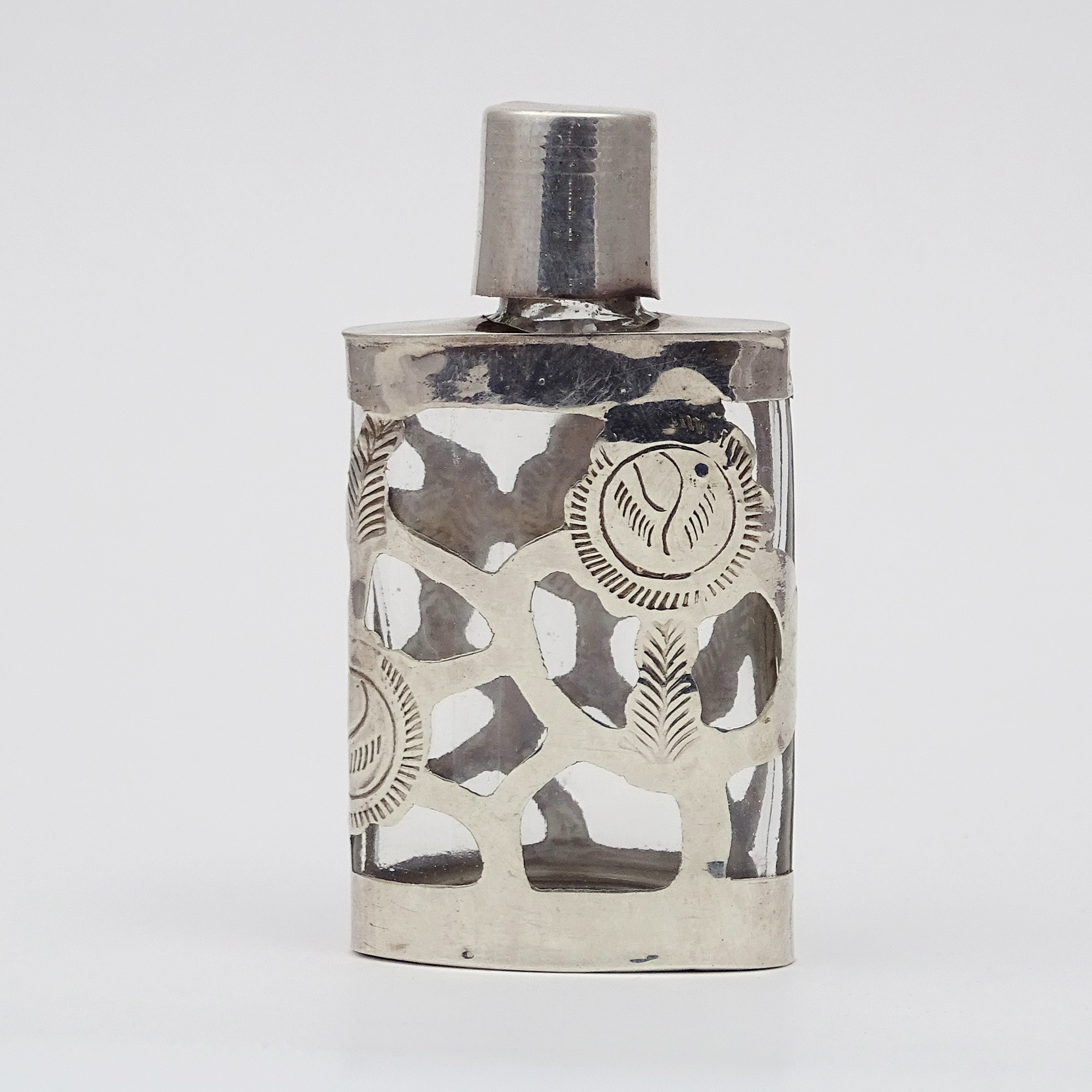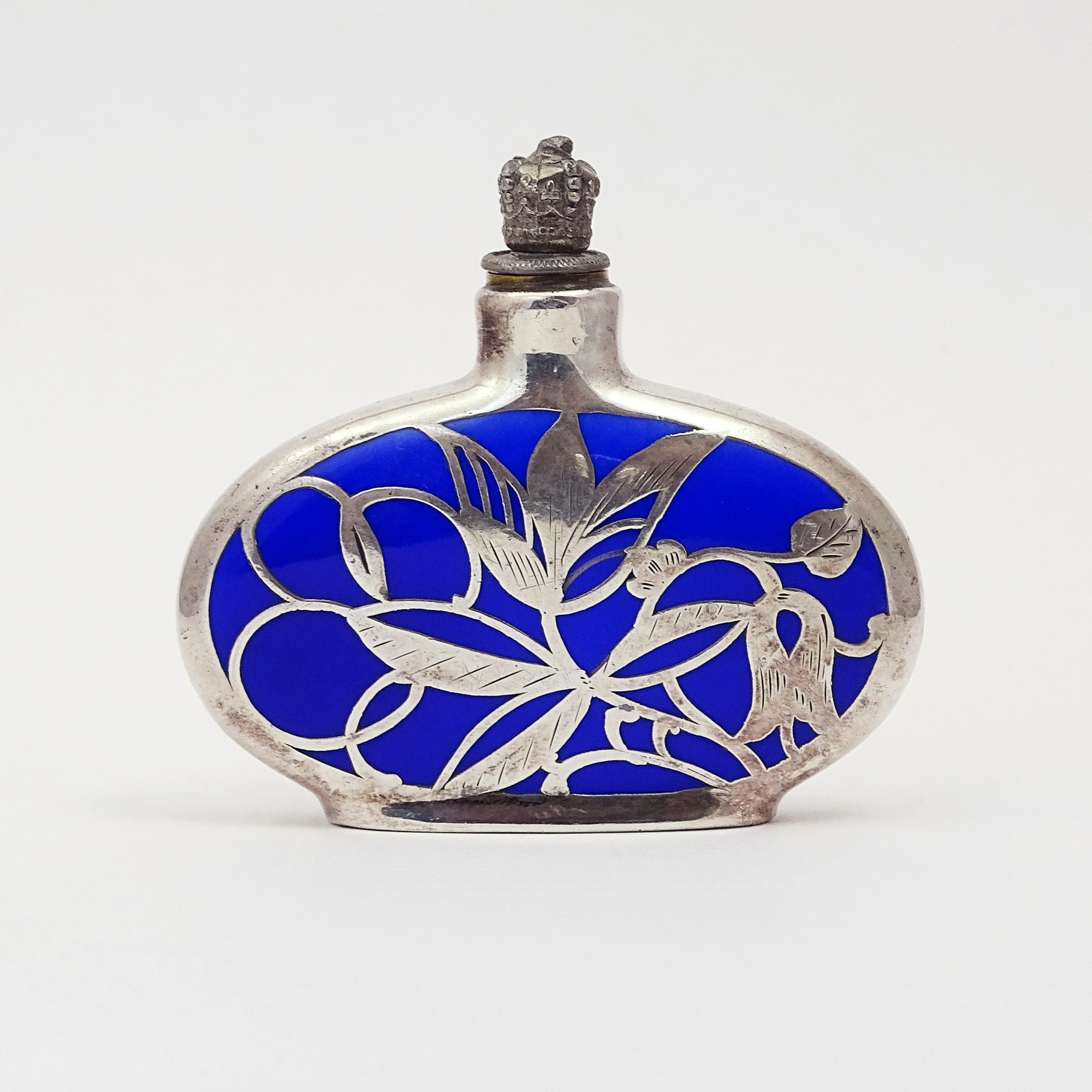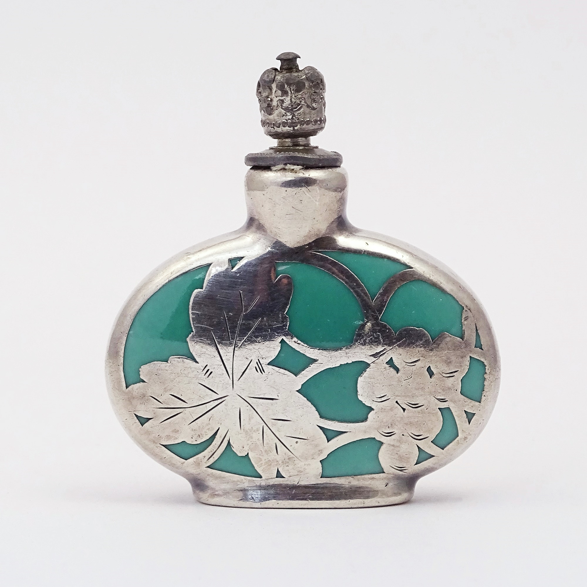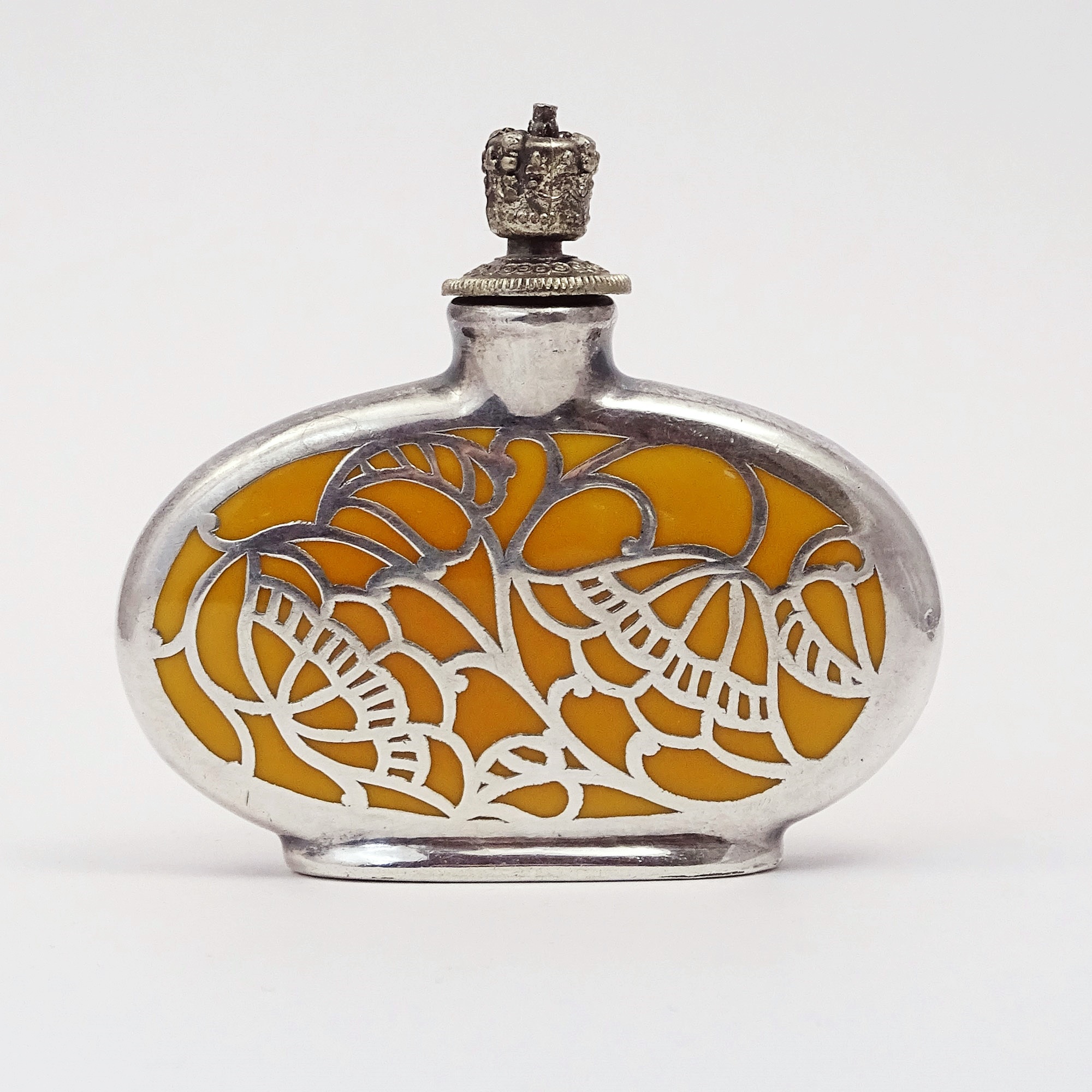 Silver overlay orange duckbill porcelain scent bottle with a floral design in Art Nouveau style Discover more