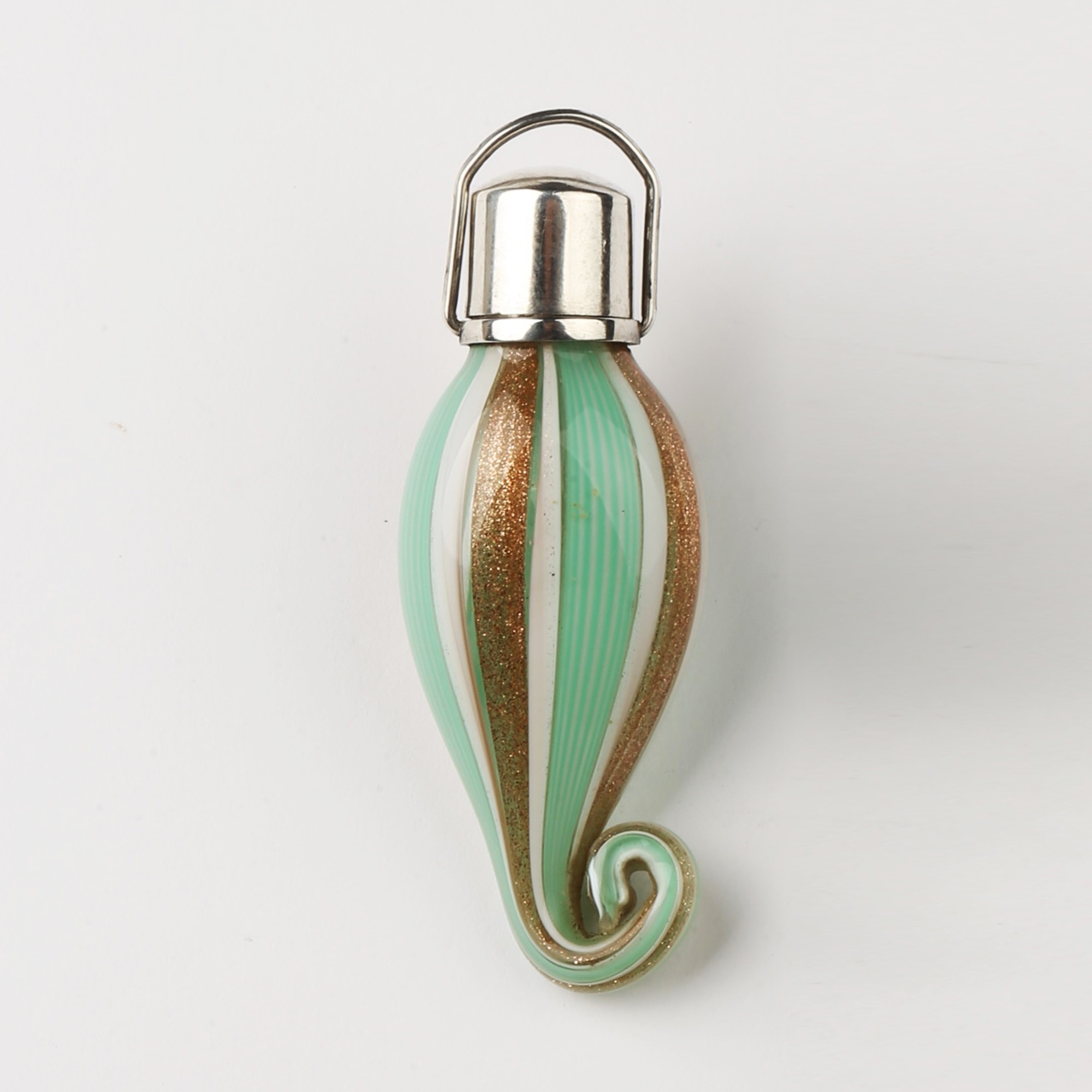 Oval scent bottle in mercury glass with blue and white swirls on orange ground on a pedestal Discover more