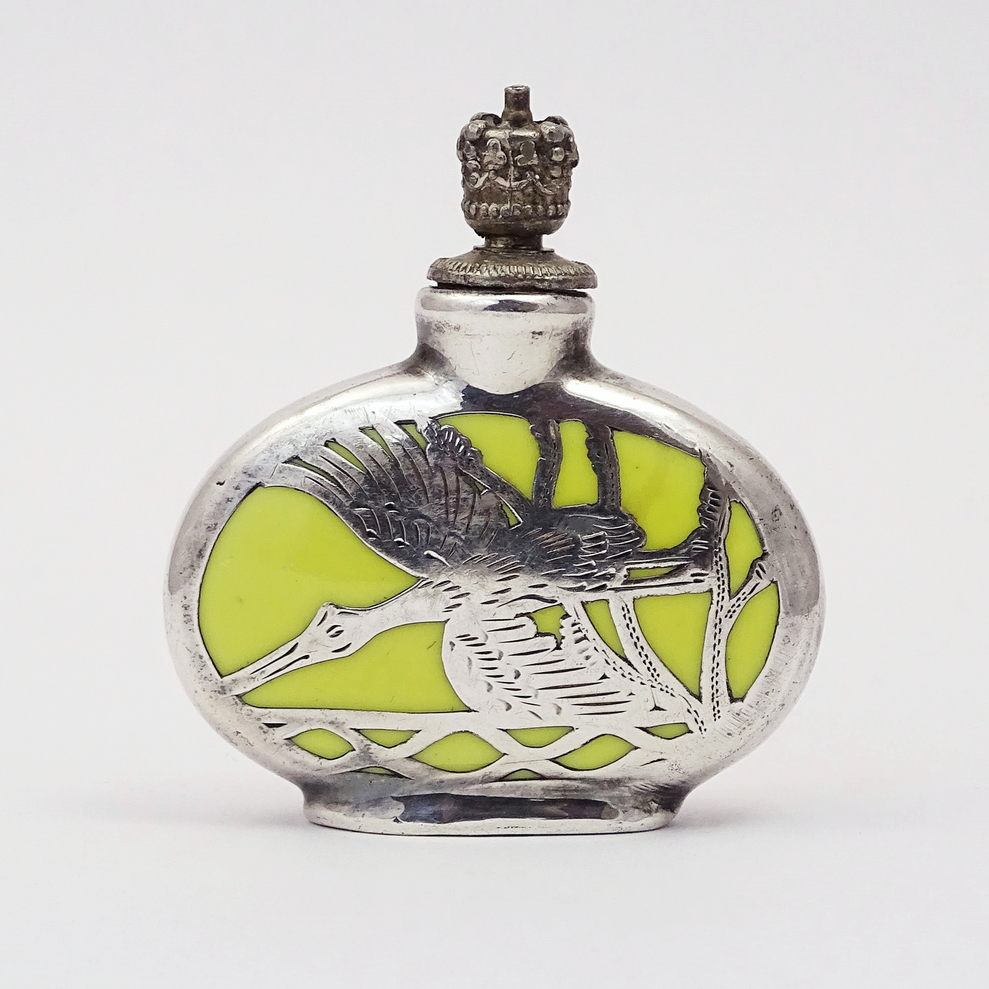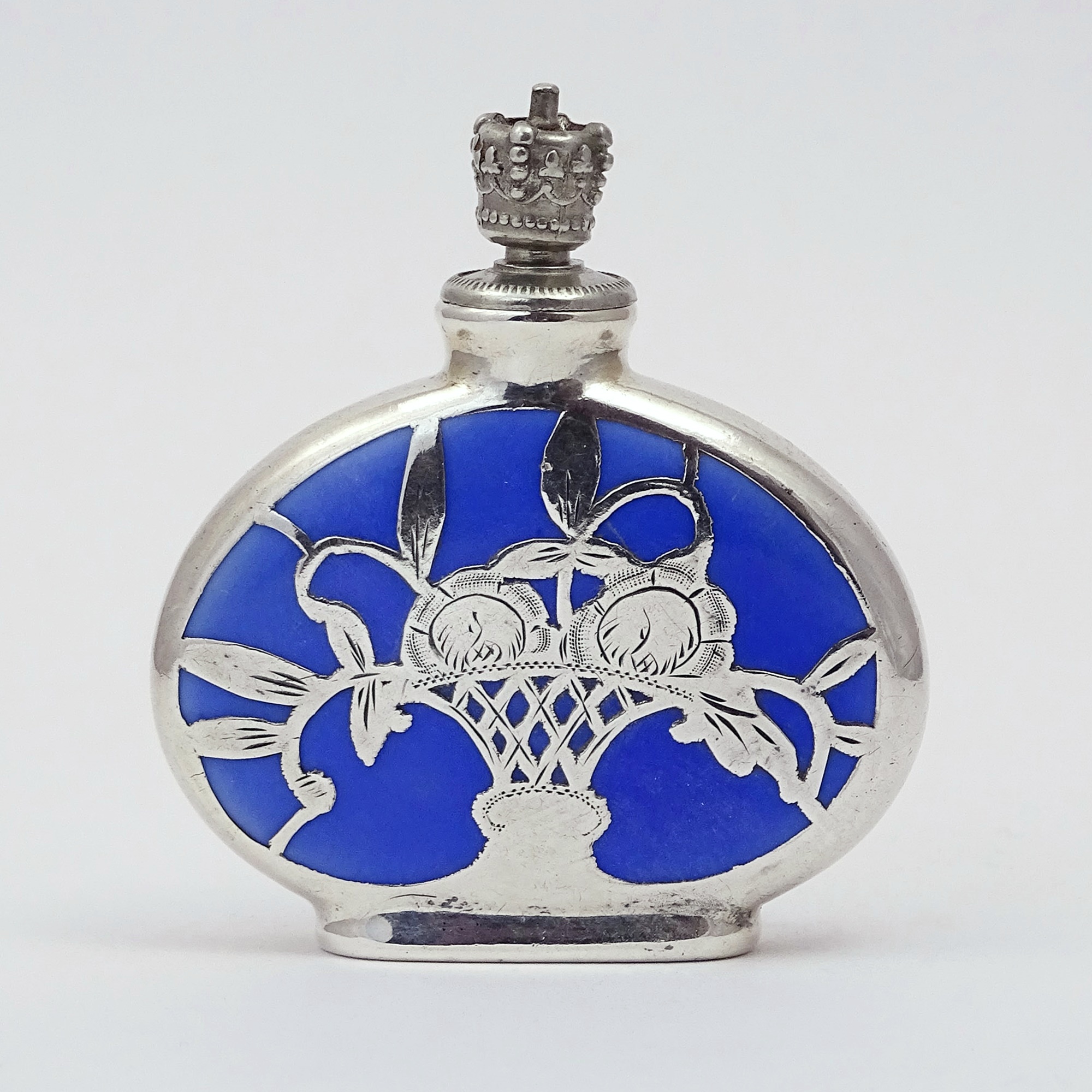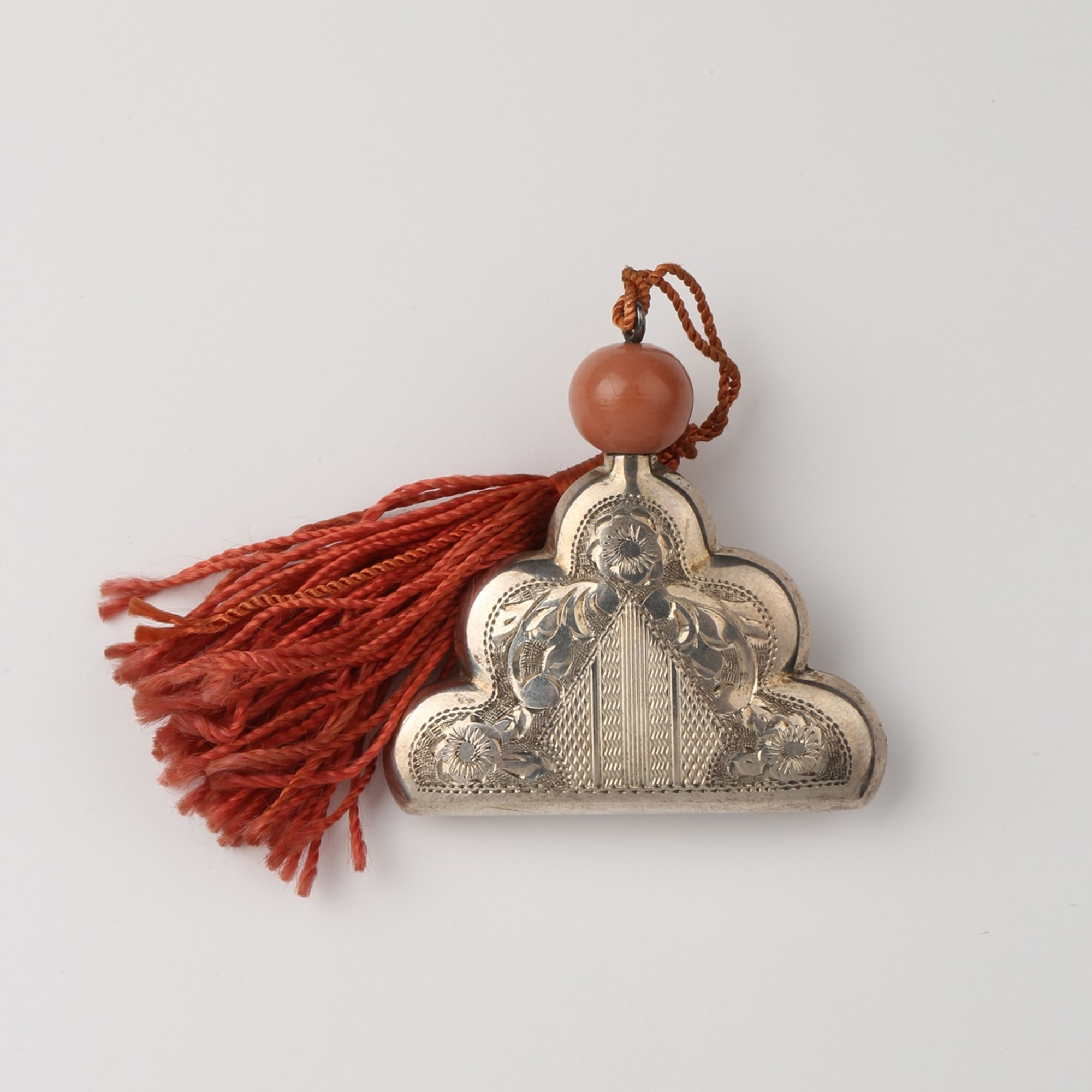 Triangular stamped silver scent bottle with both geometric and floral decor, rounded edge Discover more