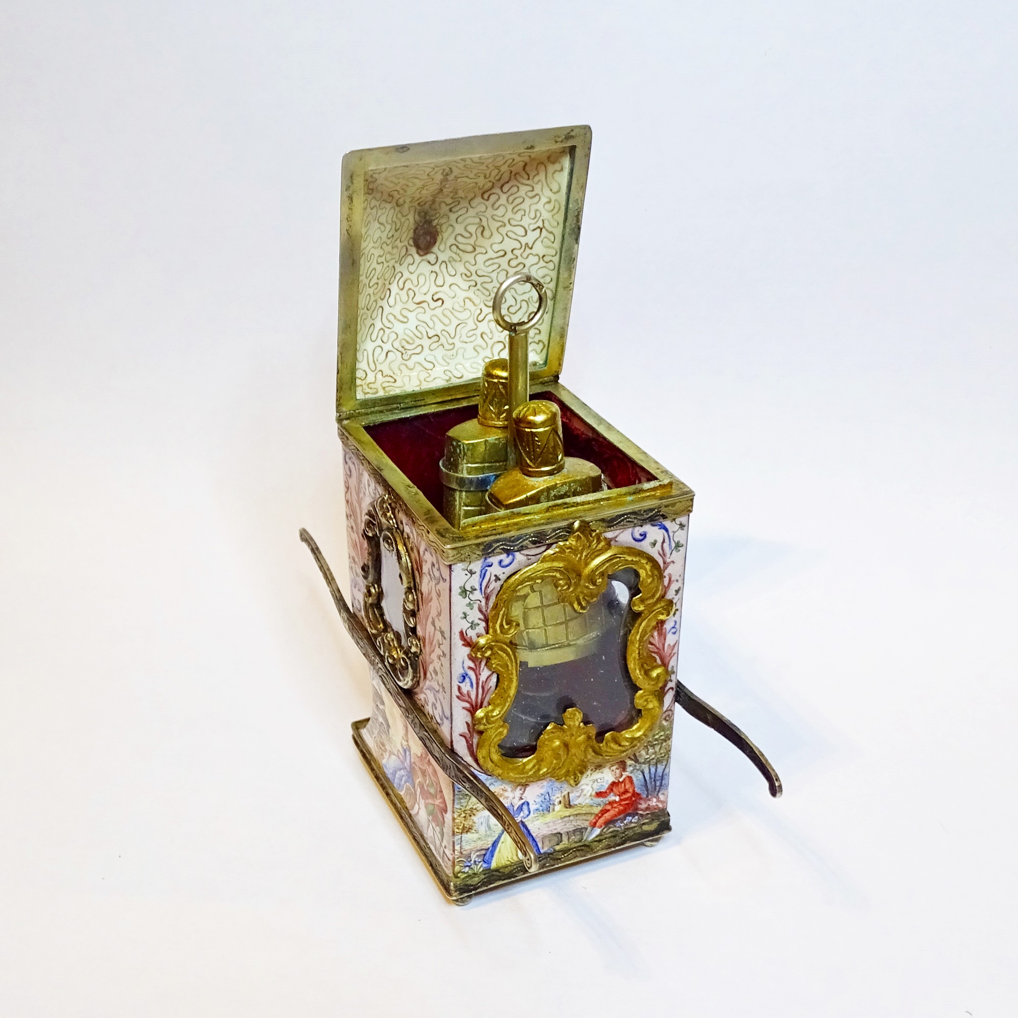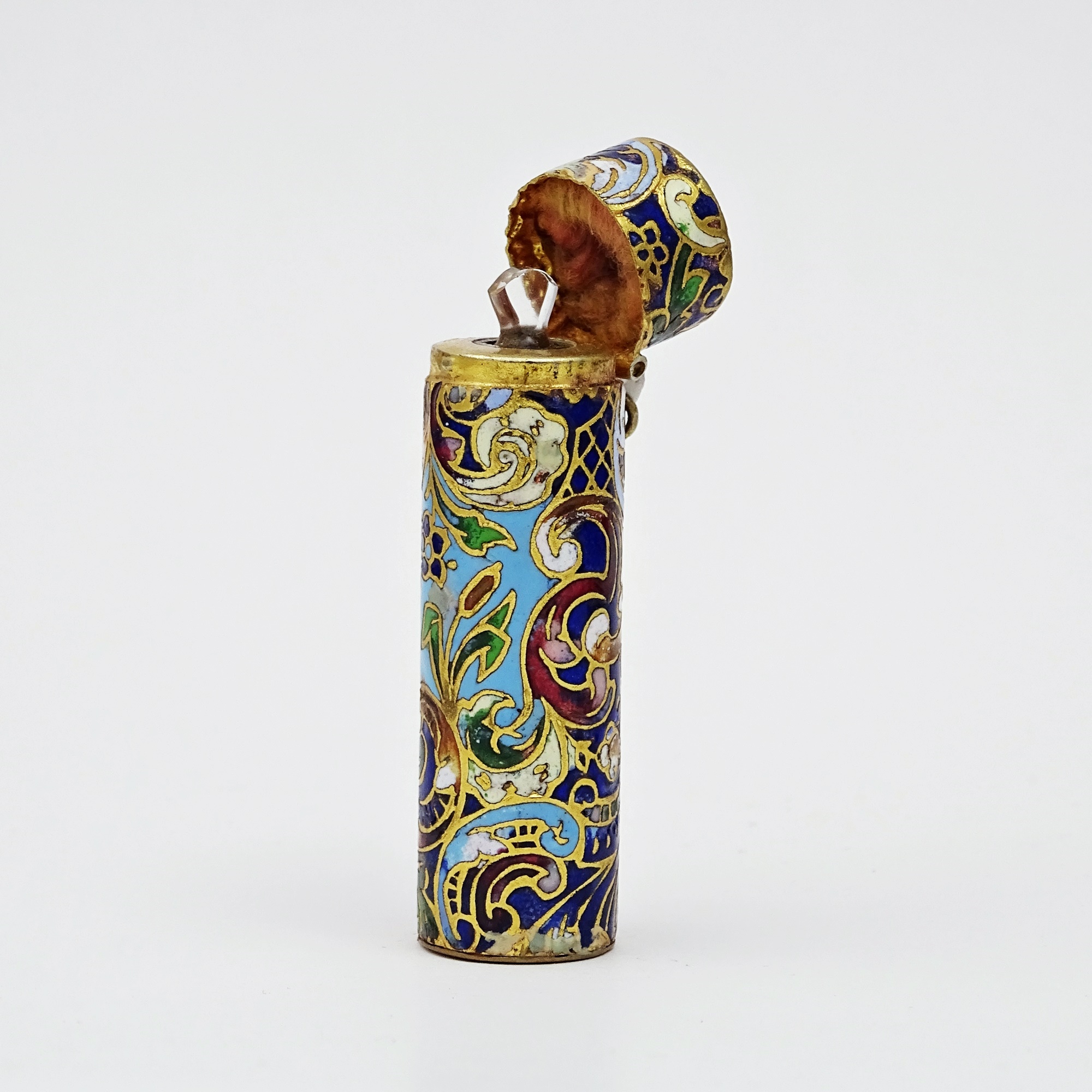 Turquoise Bilston enamel case, hand-painted with four panels of flowers and glass scent bottle Discover more