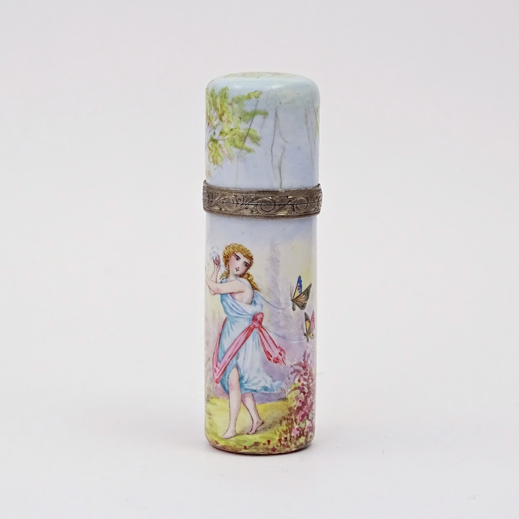 Enamelled scent bottle depicting a young woman in a blue dress dancing with a butterfly. Discover more