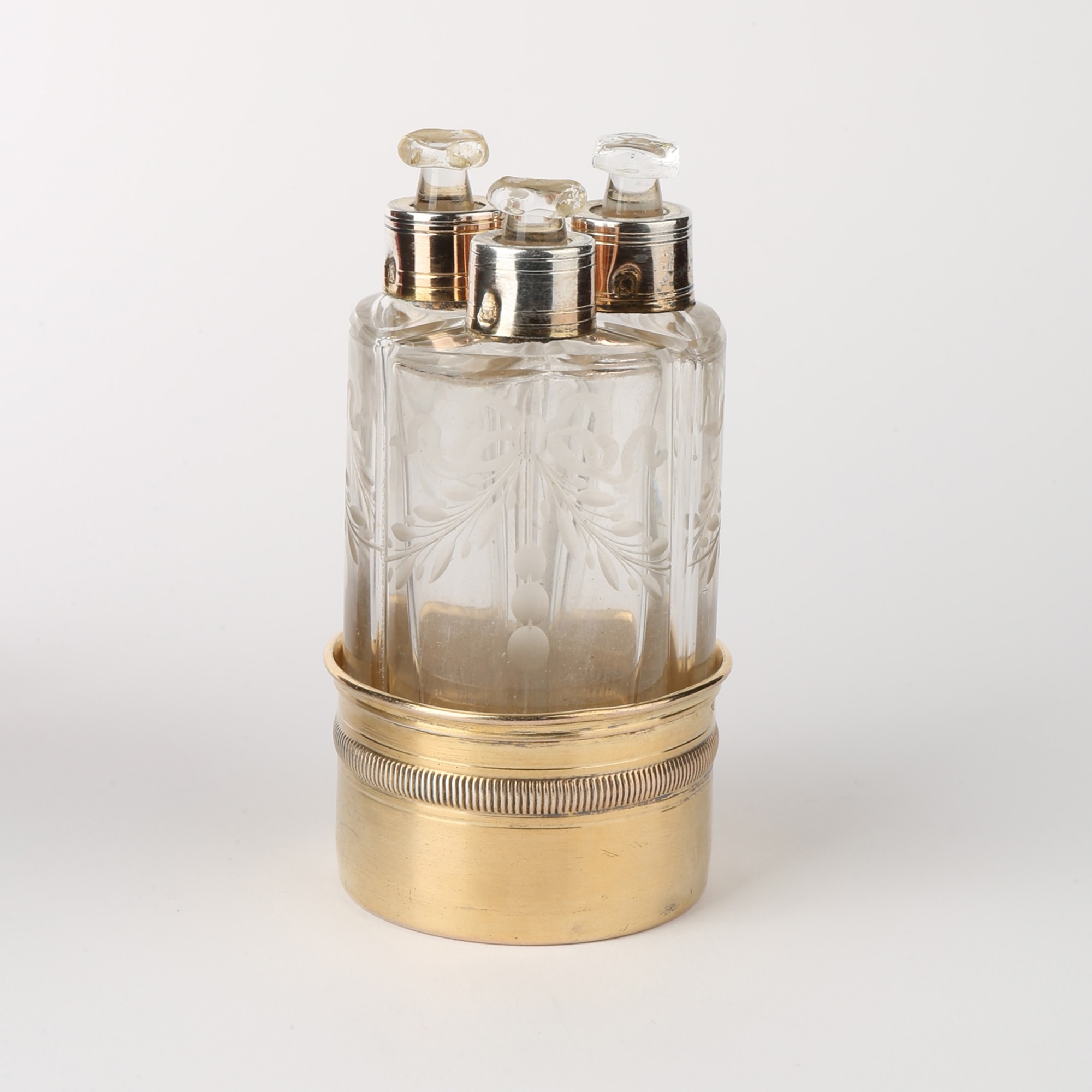 Three triangular prism-shaped perfume bottles with glass cap and vermeil collar and base Discover more