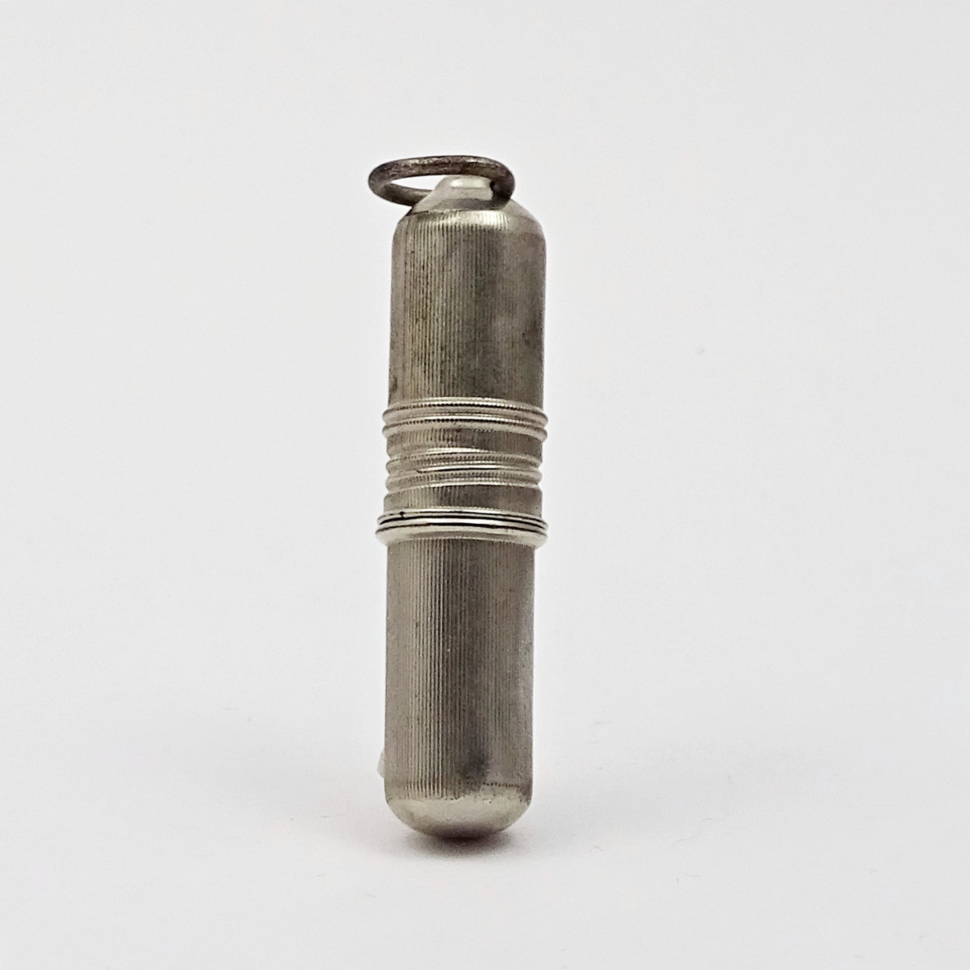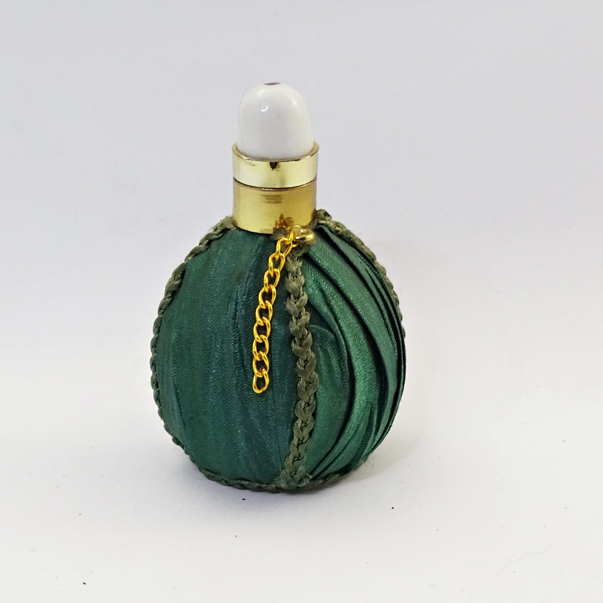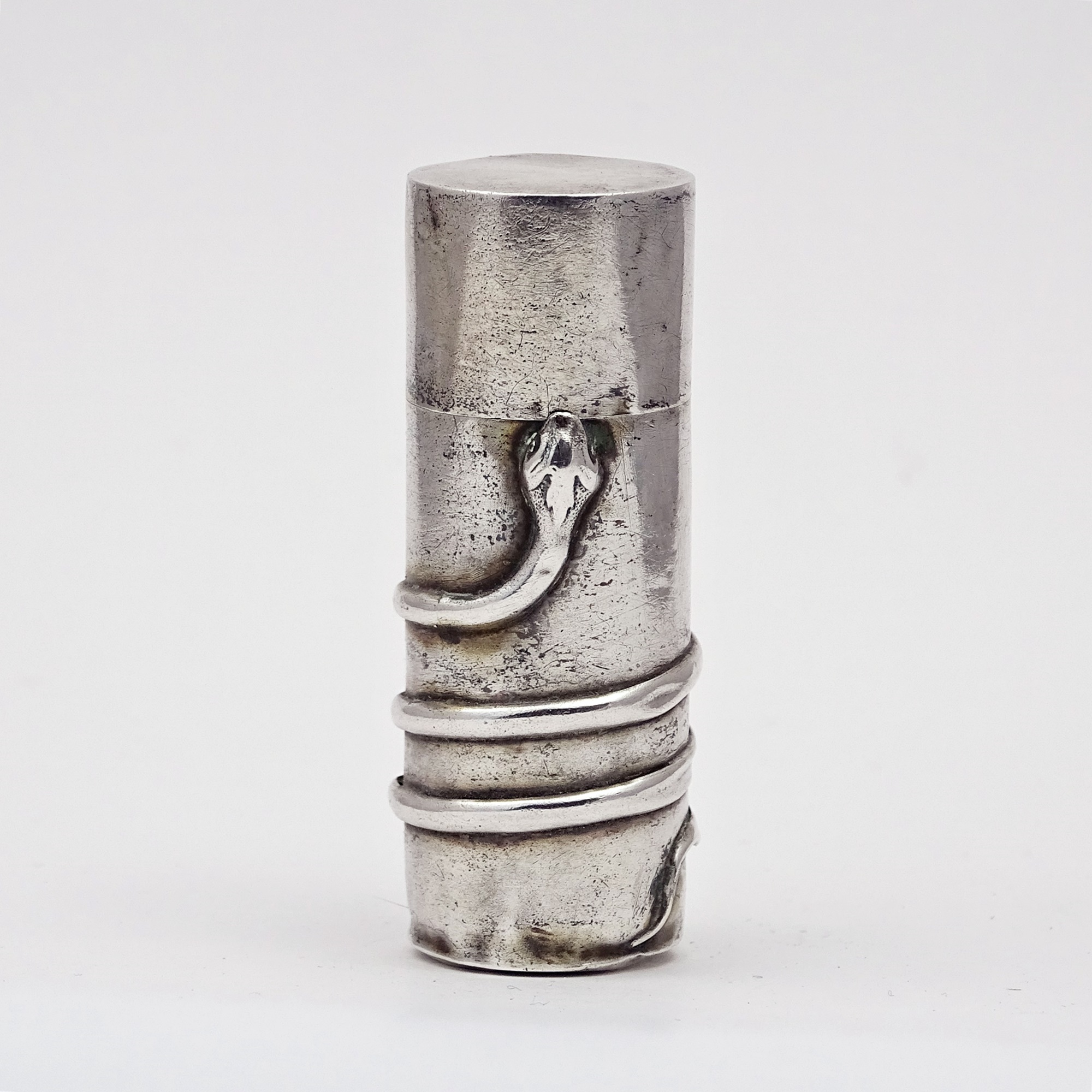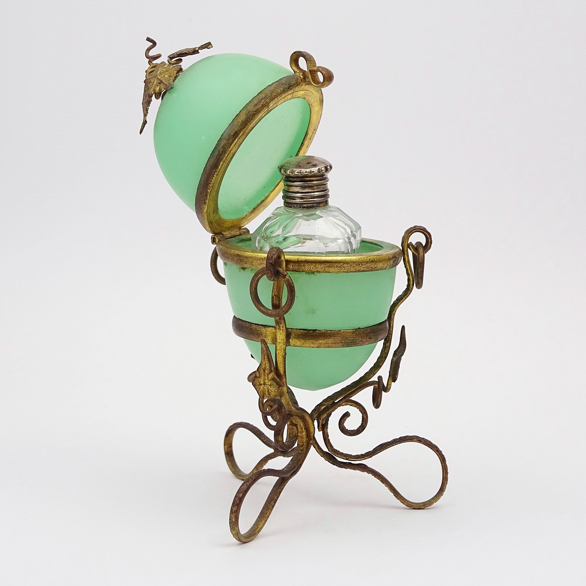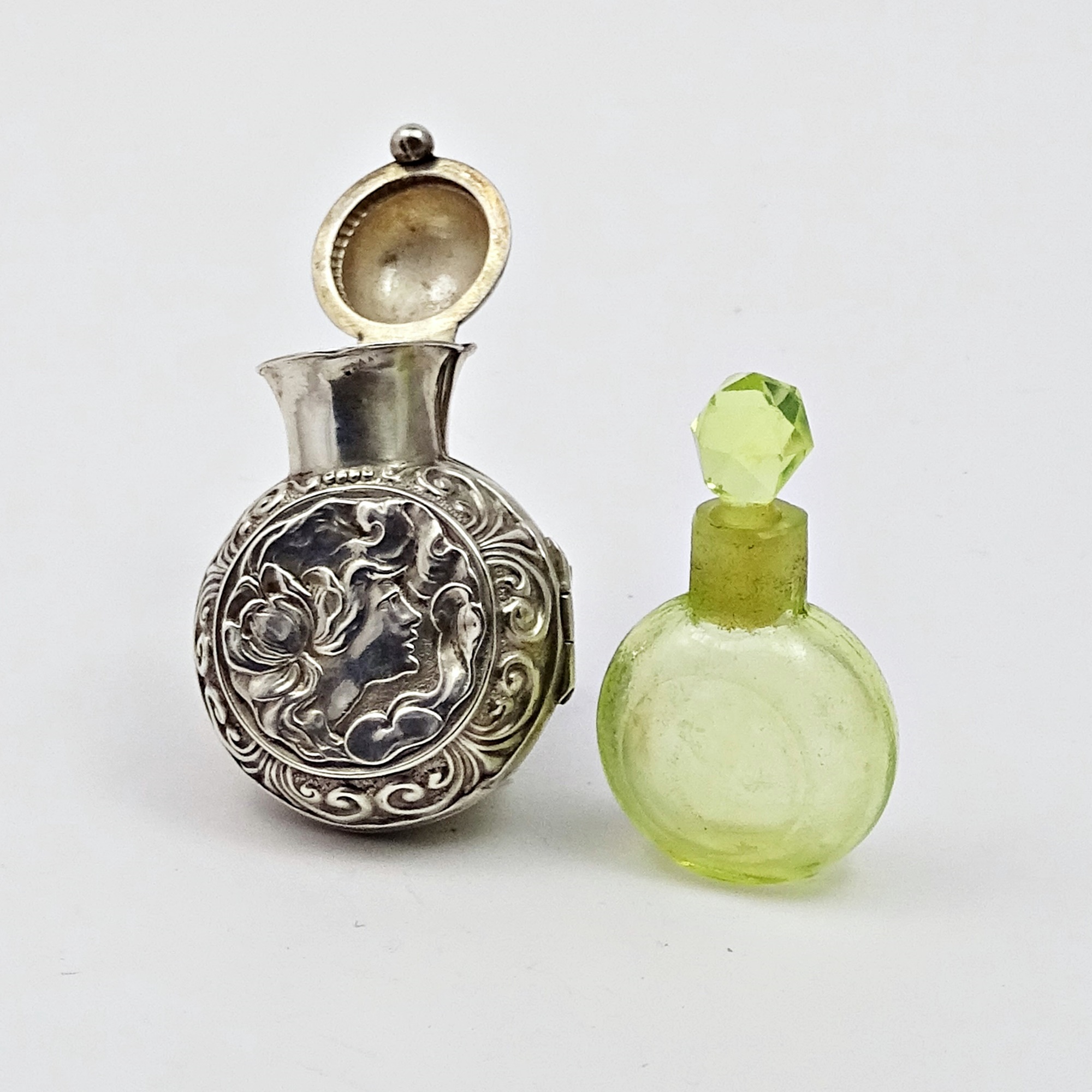 Round container in embossed silver with a portrait of a woman and a scent bottle in uranium glass Discover more