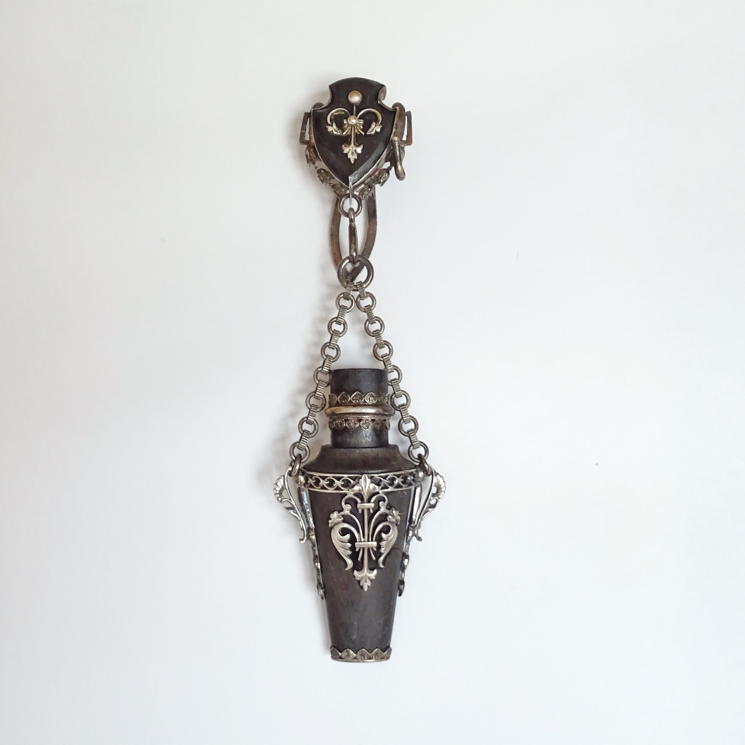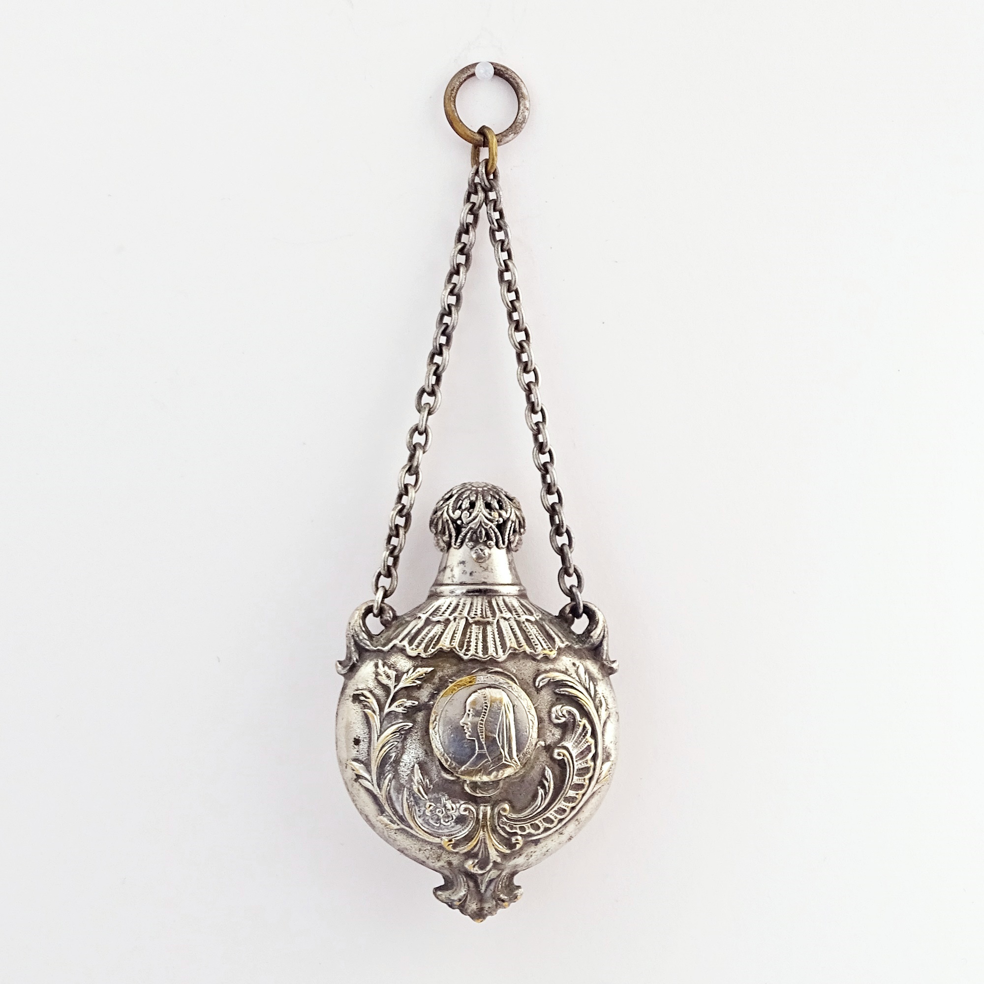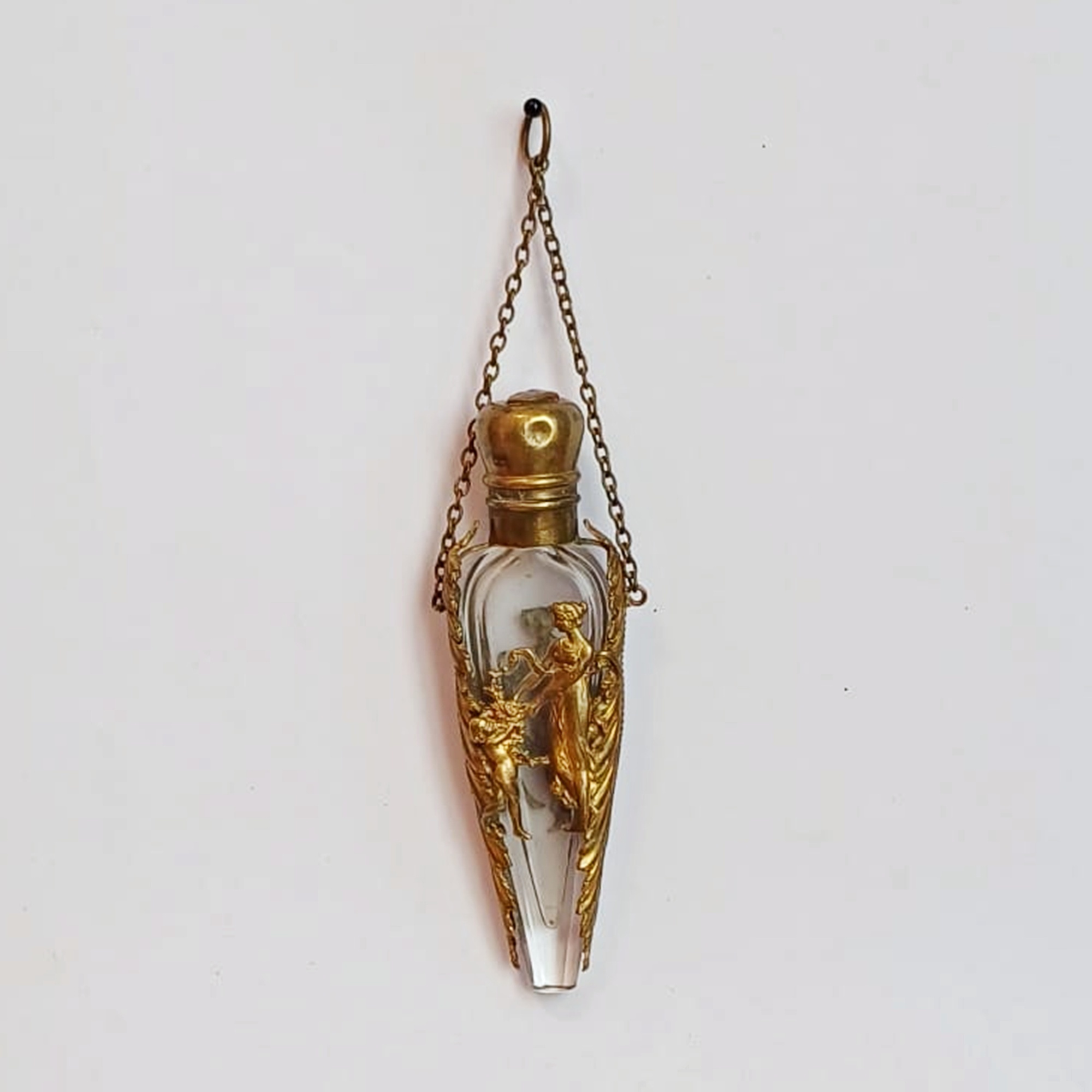 Chatelaine glass and metal scent bottle with dancing ladies and Napoleon’s bust on the cap Discover more