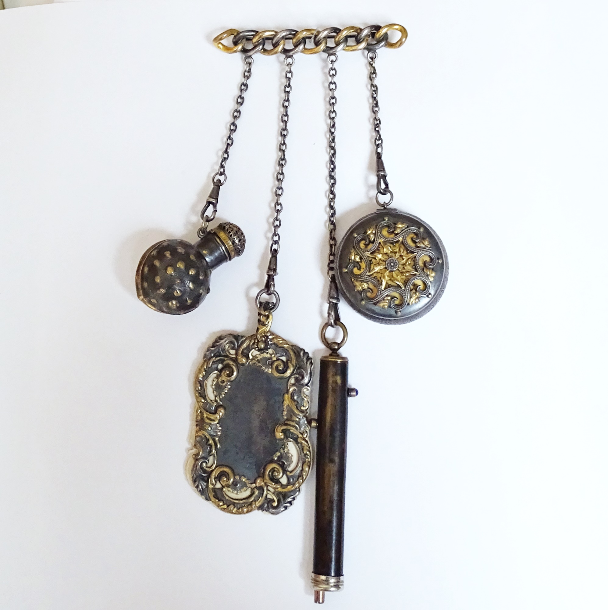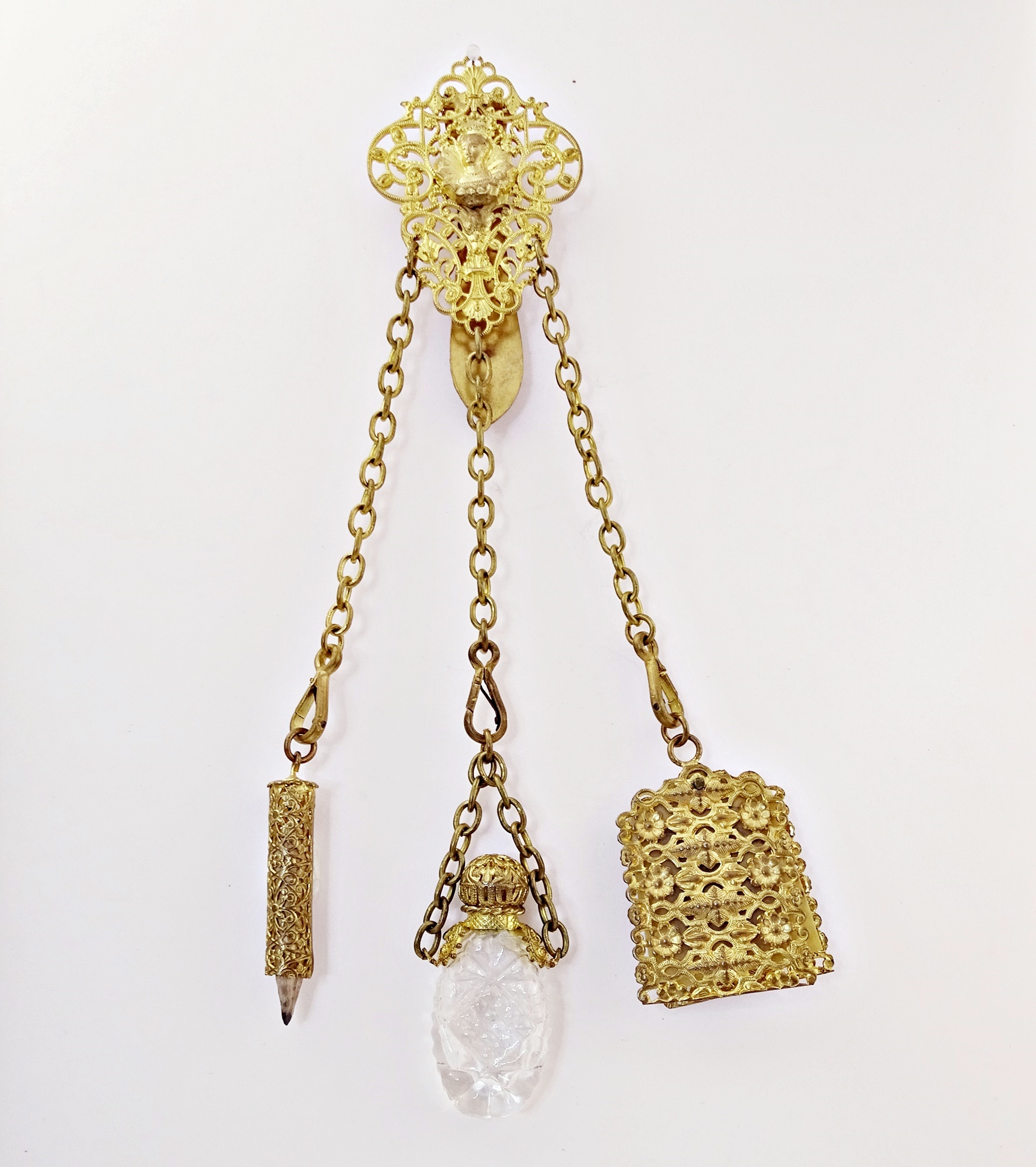 Dance chatelaine in gilt filigree metal with the portrait of a woman in Elizabethian style Discover more