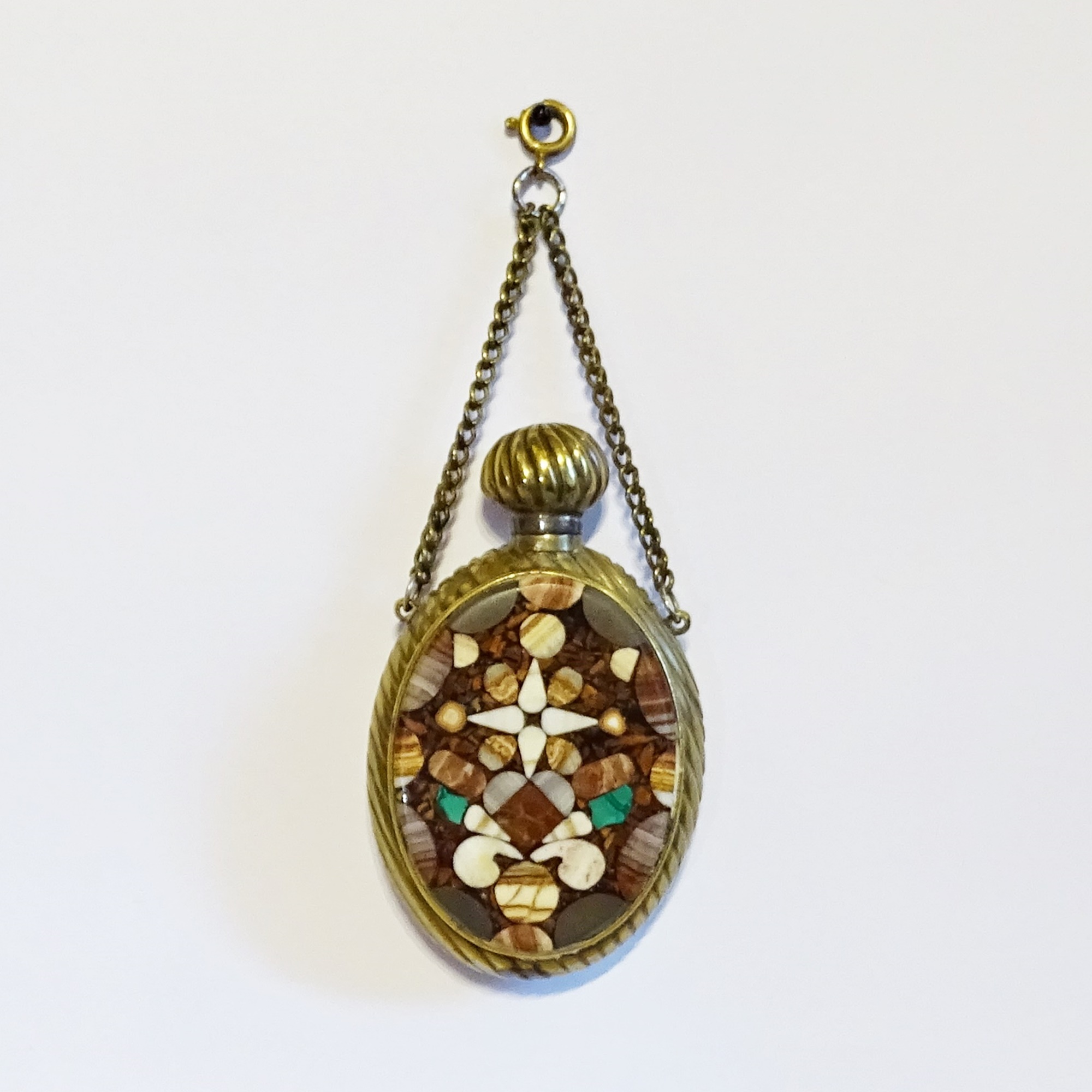 Chatelaine metal scent bottle with a geometric mosaic of multicolour semi precious stones Discover more