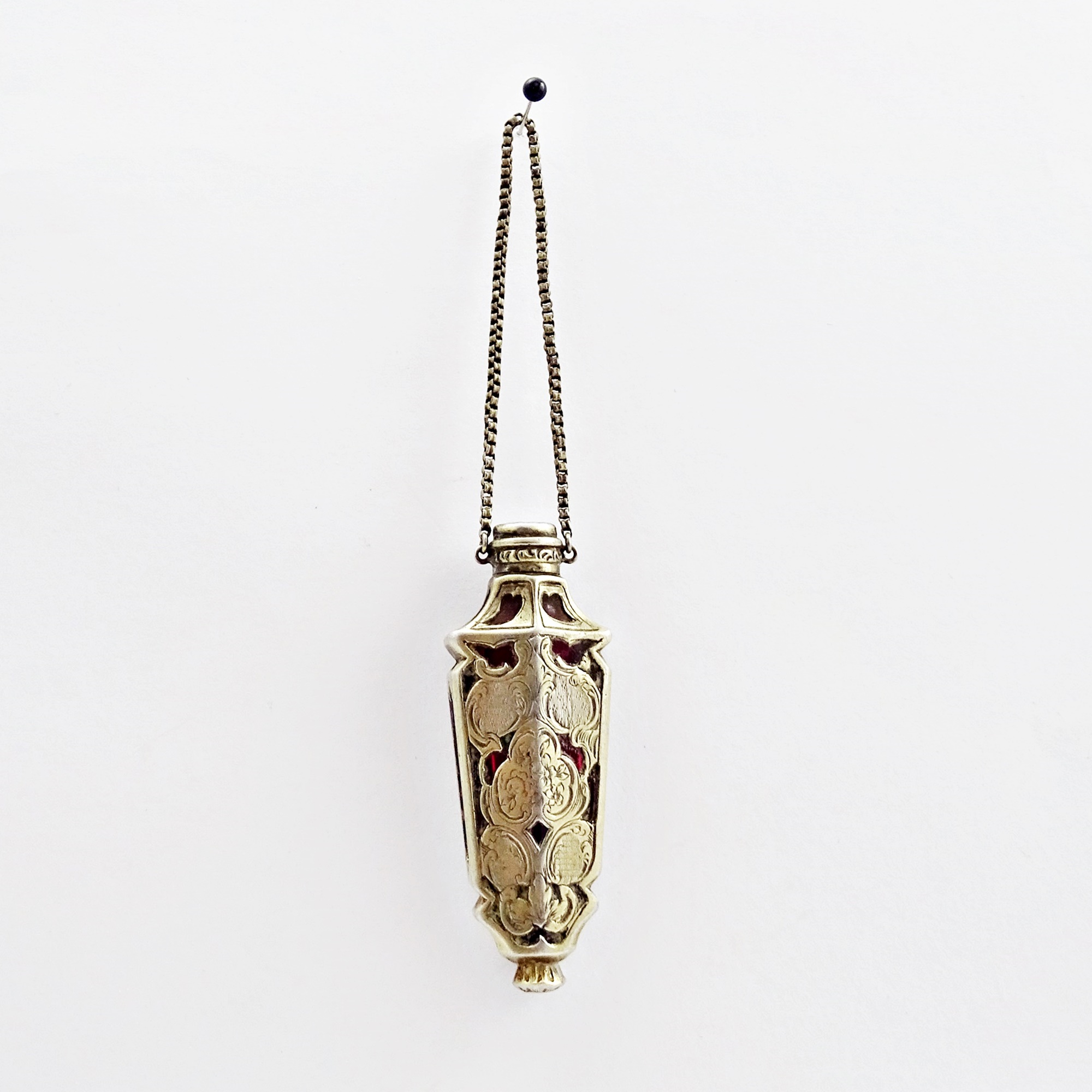 Round Chatelaine scent bottle in red glass with ormolu cage, enamelled flowers and dangles Discover more