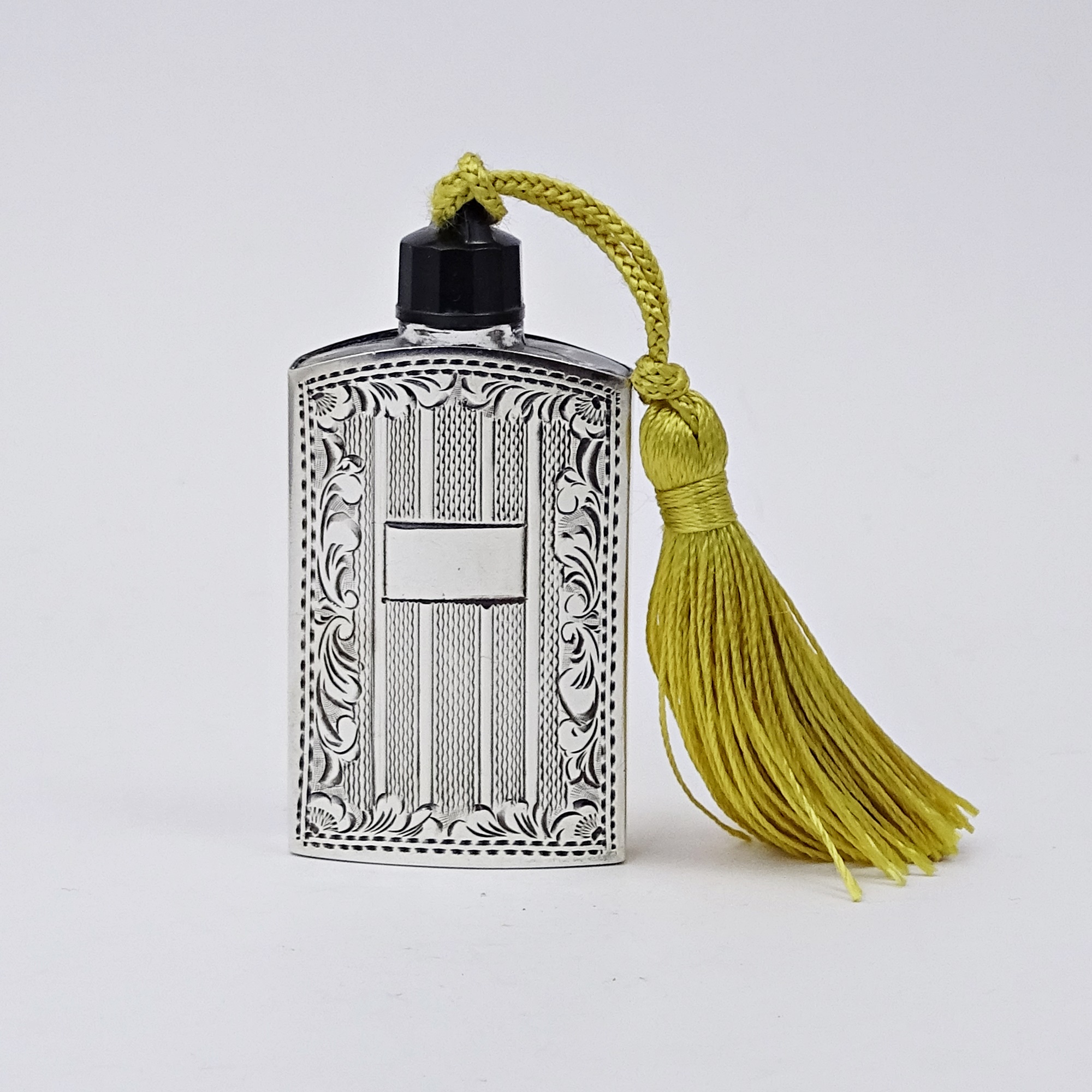 Rectangular upright scent bottle in stamped silver with scrolls frame and striped decors Discover more